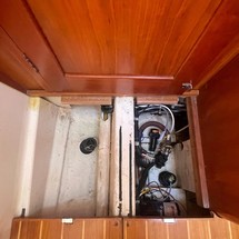 Aft and to port is this vessel's secondary cabin. This guest stateroom is composed of a substantial 6'7" x 6'2" berth that may be used fore & aft or athwartship, cedar-lined hanging locker, bureau and drawers, plush 4" foam berth cushion, beautiful hull battens, 2 opening ports, 1 vent hatch and the vessel's power selection switches.