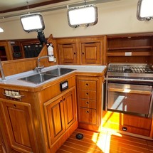 As you descend through Ardea's companionway, you're greeted with a hand crafted, satin-varnished cherry interior. Directly to starboard is her large wrap-around galley with Corian countertops, chest refrigerator and freezer, gimbaled 3-burner Force 10 LPG stove with oven, microwave, deep, double basin stainless steel sink, dedicated waste basket locker, 2 opening ports and overhead ventilation hatch and ample utensil drawers and storage outboard.