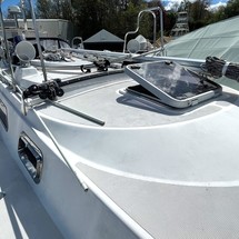 Mainsail hoisting and reefing chores are taken care of from inside the safety of the cockpit with a push of a button on the two speed, self-tailing electric winch. Mainsail handling is further simplified by a Harken TM "Batt-Car" system. The Saga 43 has several on-deck innovations. The stainless steel bowsprit supports the dual anchor rollers and gets the anchors clear of her near-plumb bow. A combination of dorade vents, opening ports, and lots of hatches provide ventilation even in tropical heat waves. Storage wells at the mast base hide away halyard tails and winch handles. Further aft another set of coaming wells store the mainsheet, reefing lines, and halyards that are led aft, clearing the inevitable clutter in the cockpit. A self-draining storage locker for a six-man valise liferaft and even a proper CG approved vented locker to store the gasoline for the dinghy's motor are important features. The cockpit features 7'6" sculpted seats suitable for sleeping under the stars.
