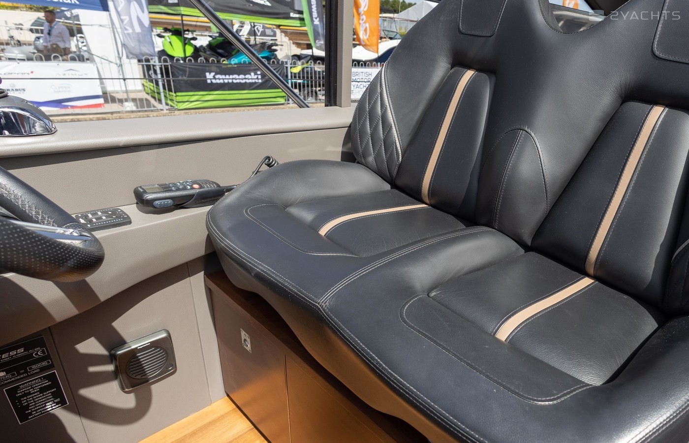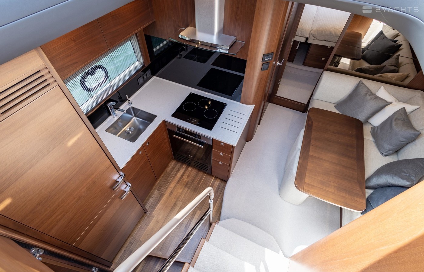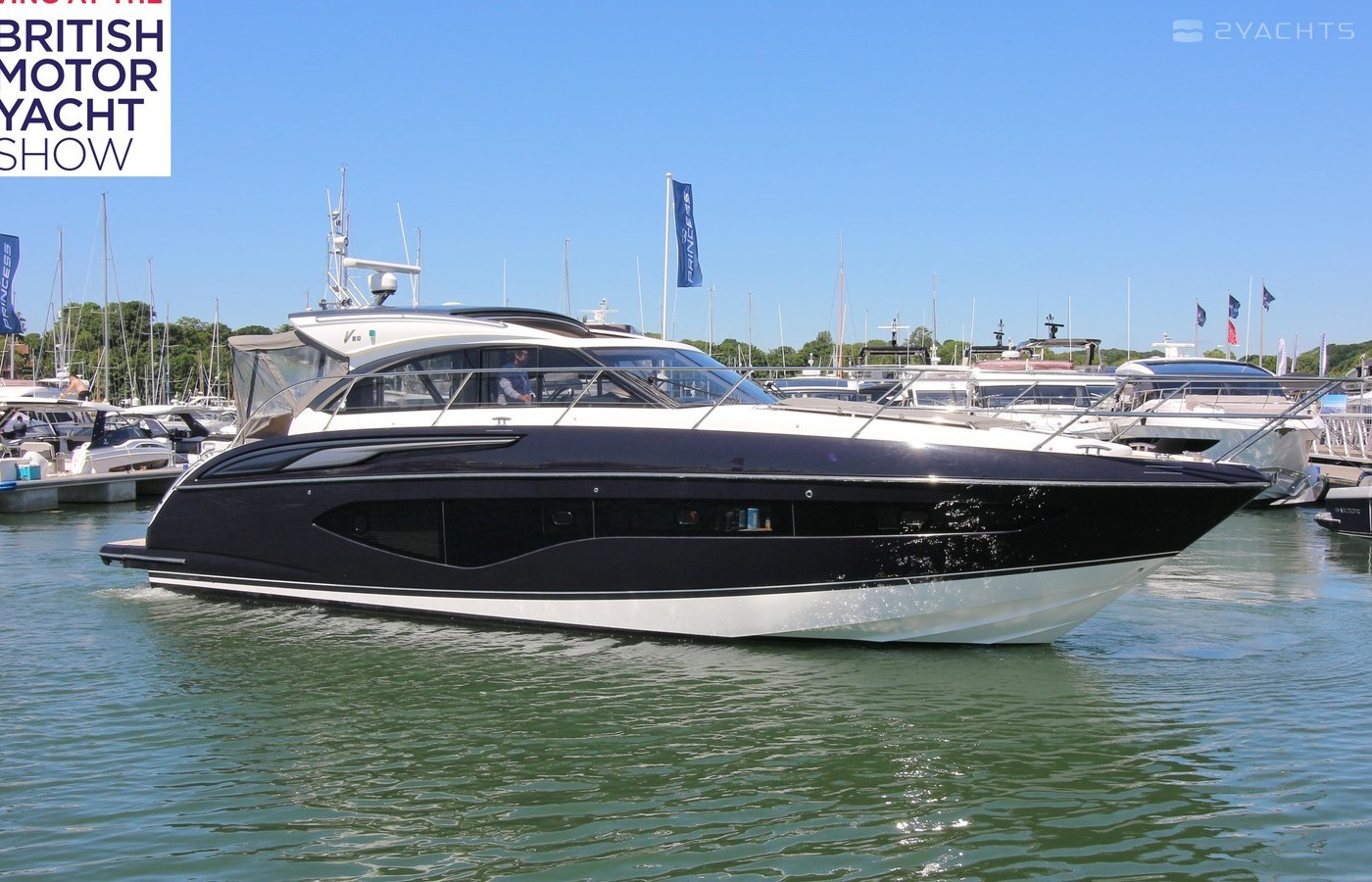 Twin Volvo IPS 600 (2x 435hp) Diesel engines • 2 Cabins accommodating 4 Guests • Midnight blue hull • Allure styling upgrade package • Walnut interior wood, satin finish • 11kW Onan generator • Bow thruster • 2 cabins plus convertible dining table in lower saloon • Reverse cycle air-conditioning • Telescopic passerelle • Electro-hydraulic transom platform • Raymarine e165 chartplotter with 48" 4kW radar scanner • Cockpit wetbar • Ice-maker • On-board Wi-Fi system • Docking camera • Grey Sunbrella cockpit covers