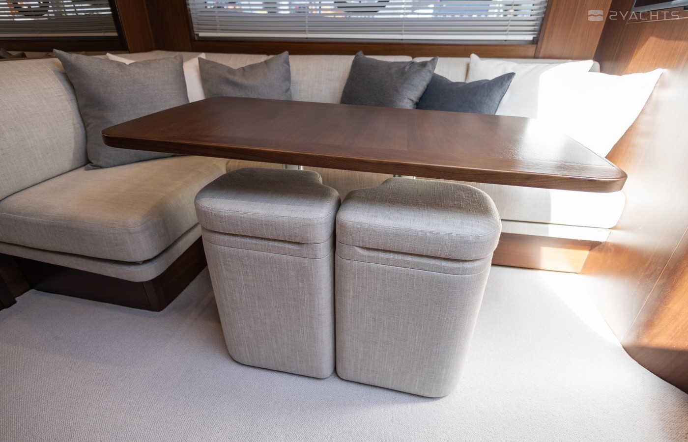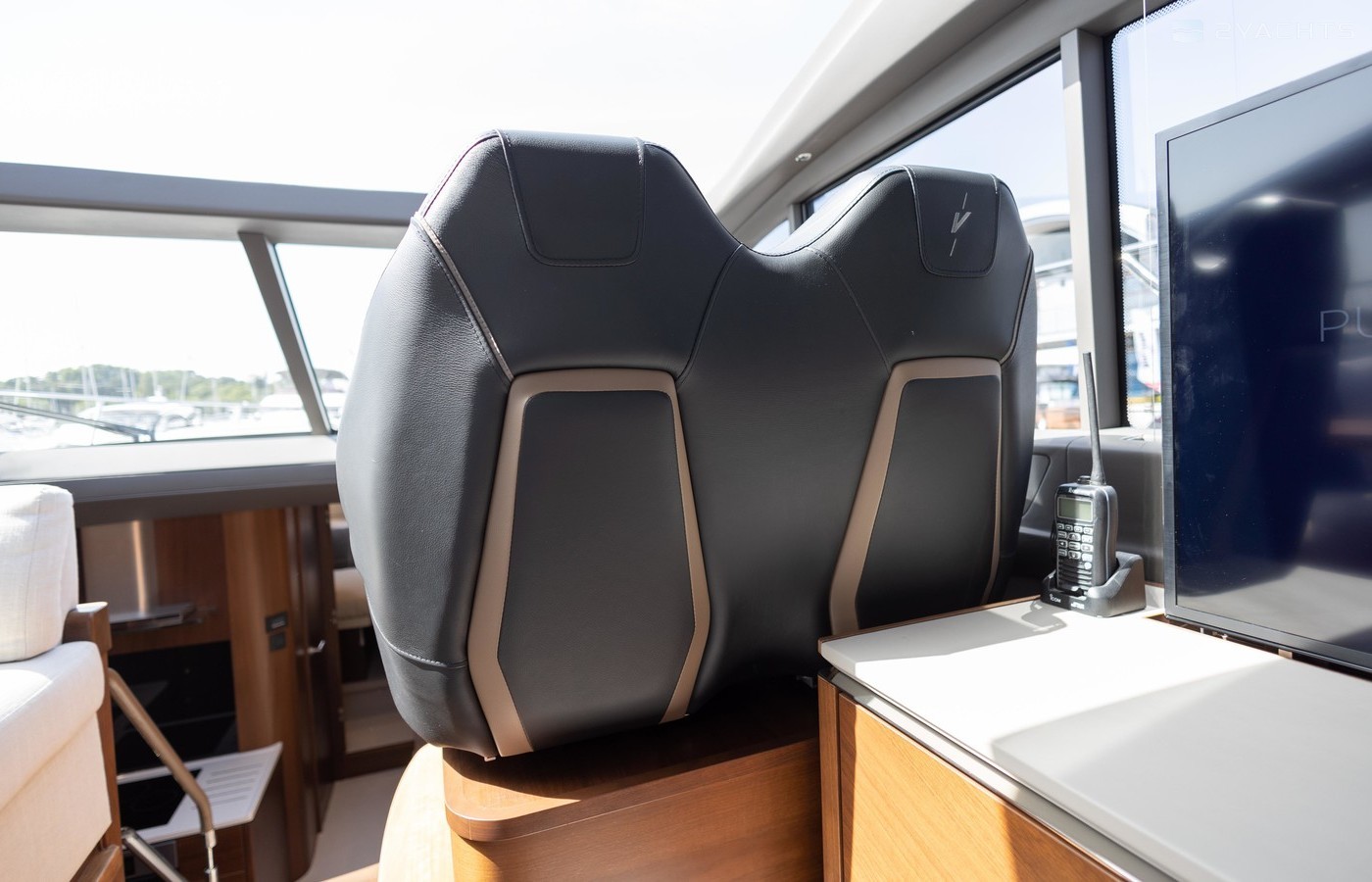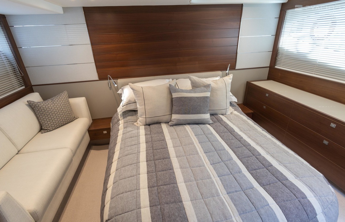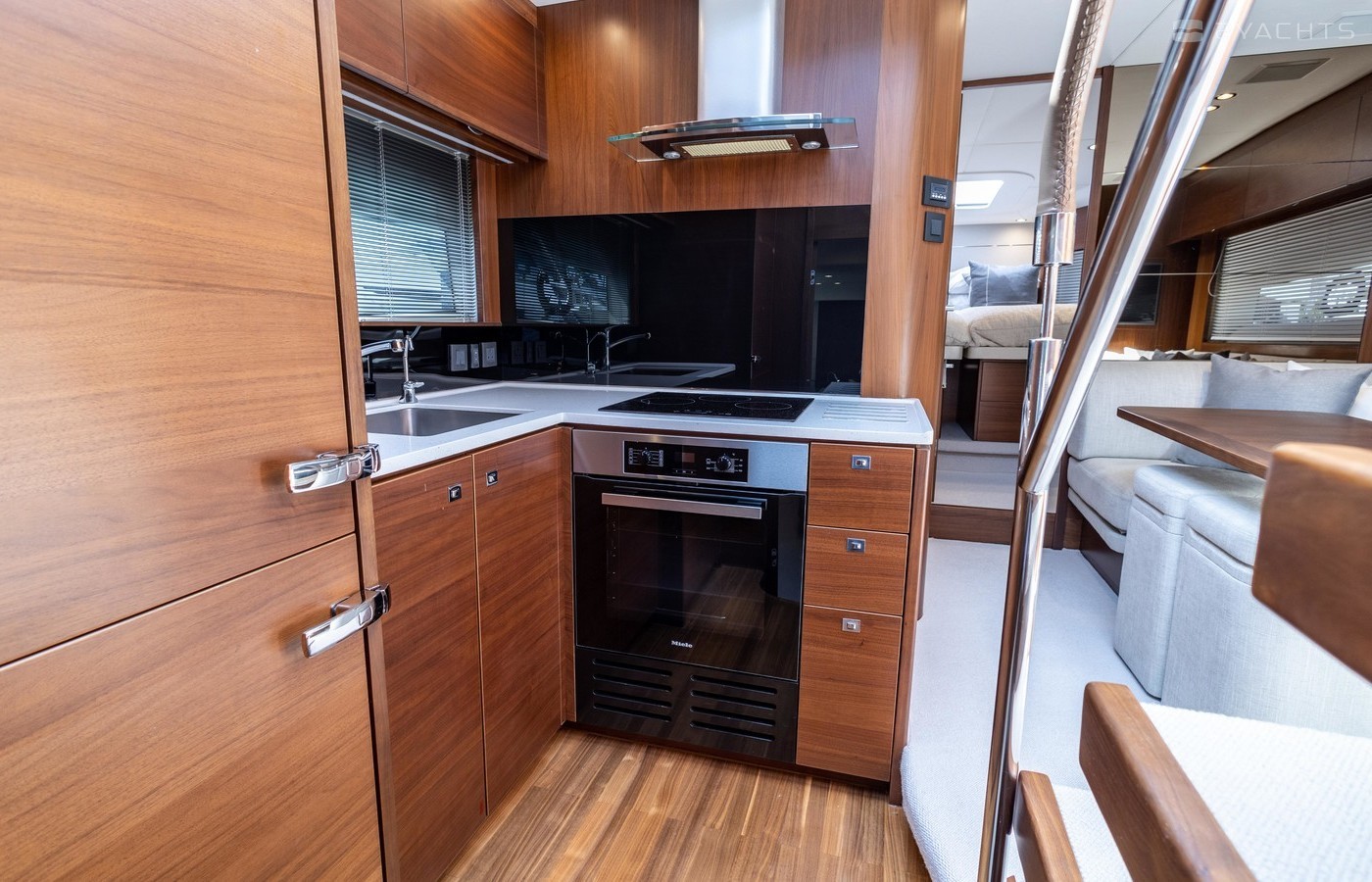 Twin Volvo IPS 600 (2x 435hp) Diesel engines • 2 Cabins accommodating 4 Guests • Midnight blue hull • Allure styling upgrade package • Walnut interior wood, satin finish • 11kW Onan generator • Bow thruster • 2 cabins plus convertible dining table in lower saloon • Reverse cycle air-conditioning • Telescopic passerelle • Electro-hydraulic transom platform • Raymarine e165 chartplotter with 48" 4kW radar scanner • Cockpit wetbar • Ice-maker • On-board Wi-Fi system • Docking camera • Grey Sunbrella cockpit covers