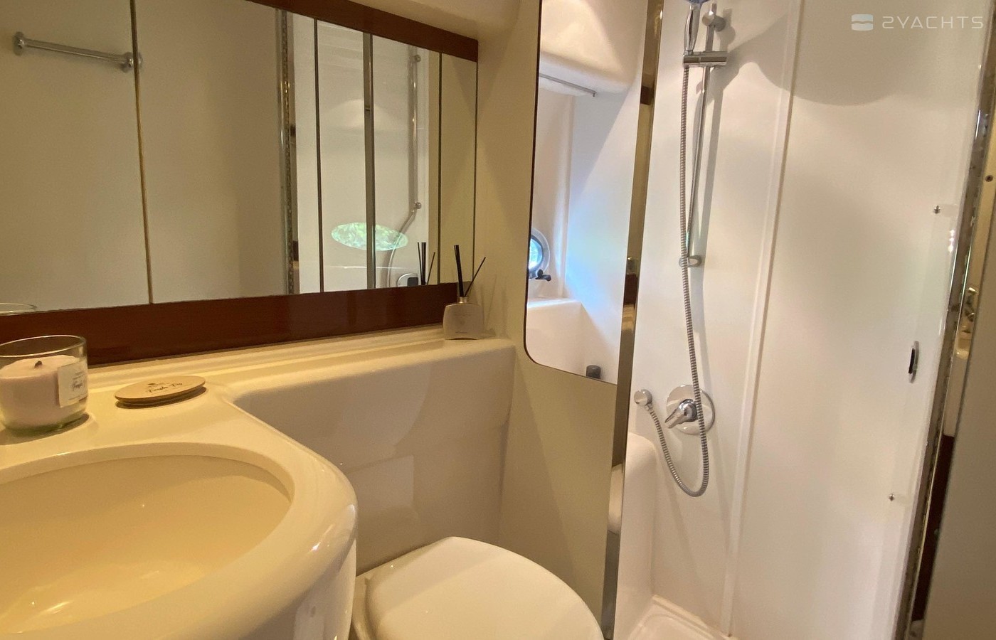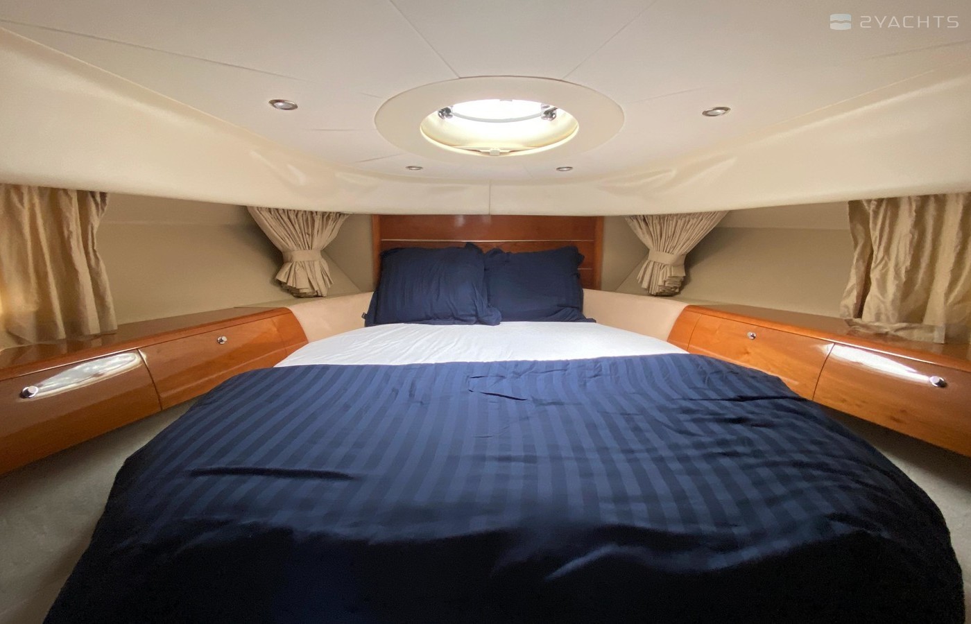 Whether judged on accommodation ,styling or speed, the V48 sets a new standard for her class. The cockpit is fully equipped for entertaining. Cockpit covers can be positioned for complete enclosure, as a bimini sun shade. This craft has the option of a electrically operated sunroof arrangement . A garage beneath the aft subbed provides stowage for a tender or wet bike. The roomy saloon incorporates an all-electric galley. Both the double master cabin and full beam twin berth guest cabin have en-suite bathrooms with stall showers. For occasional guests, the saloon sofa converts into a double berth.