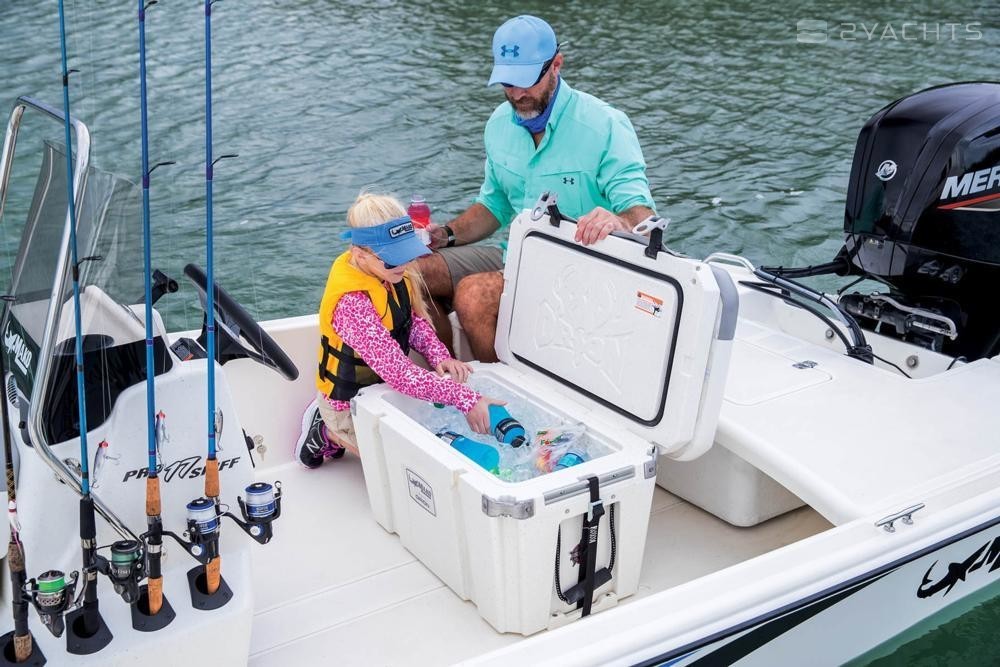 Molded center console w/integrated 8-gal. (30.28 L) baitwell, molded-in grab handles & hinged padded seat cushion & back