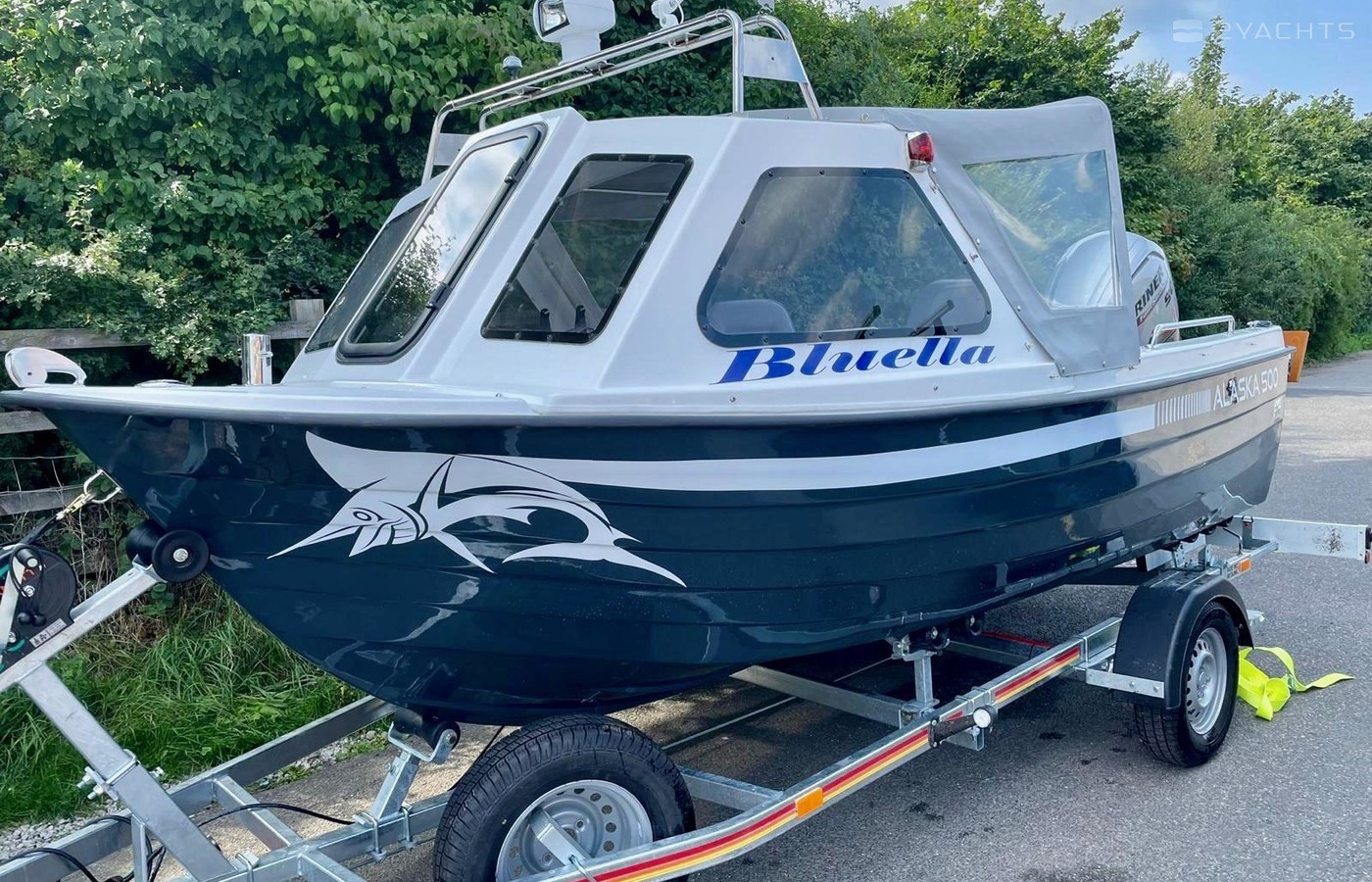 This Alaska 500 has undergone lots of changes from the original being retooled with enclosed sides and the neat looking swept back cabin, plus the hull is double skinned incorporating woven sandwich construction with built in wiring channels. The boat is said to be virtually unsinkable.