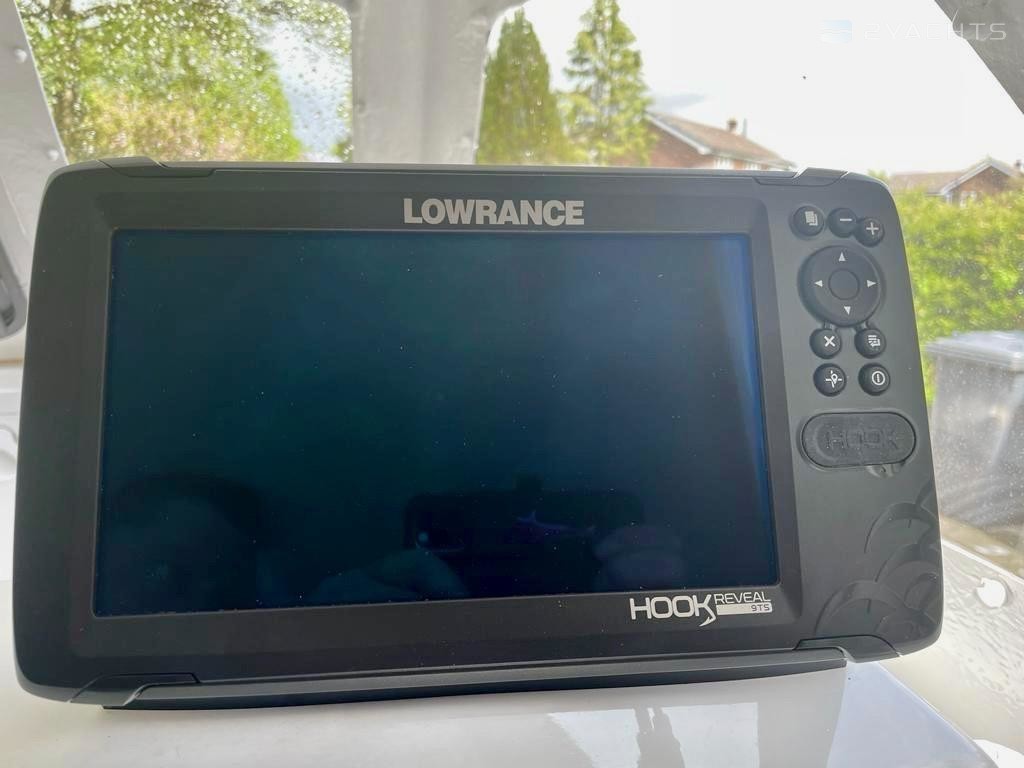 On deck the helm seat is positioned on the starboard side. The boat is fitted with two upholstered seats with locker access in to the seat console. The helm console features a stainless steel wheel with room for all the instruments on the facing console which incorporates the Mercury vessel view, plus the state of the art Lowrance Hook Reveal 9 and Richie compass on the consoles flat top.