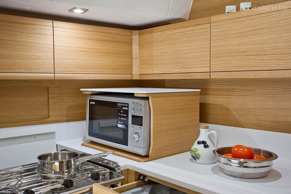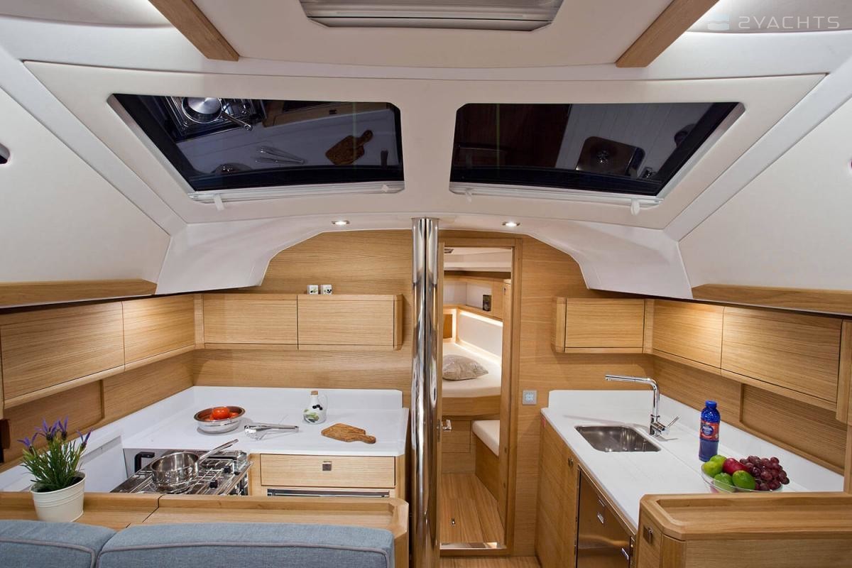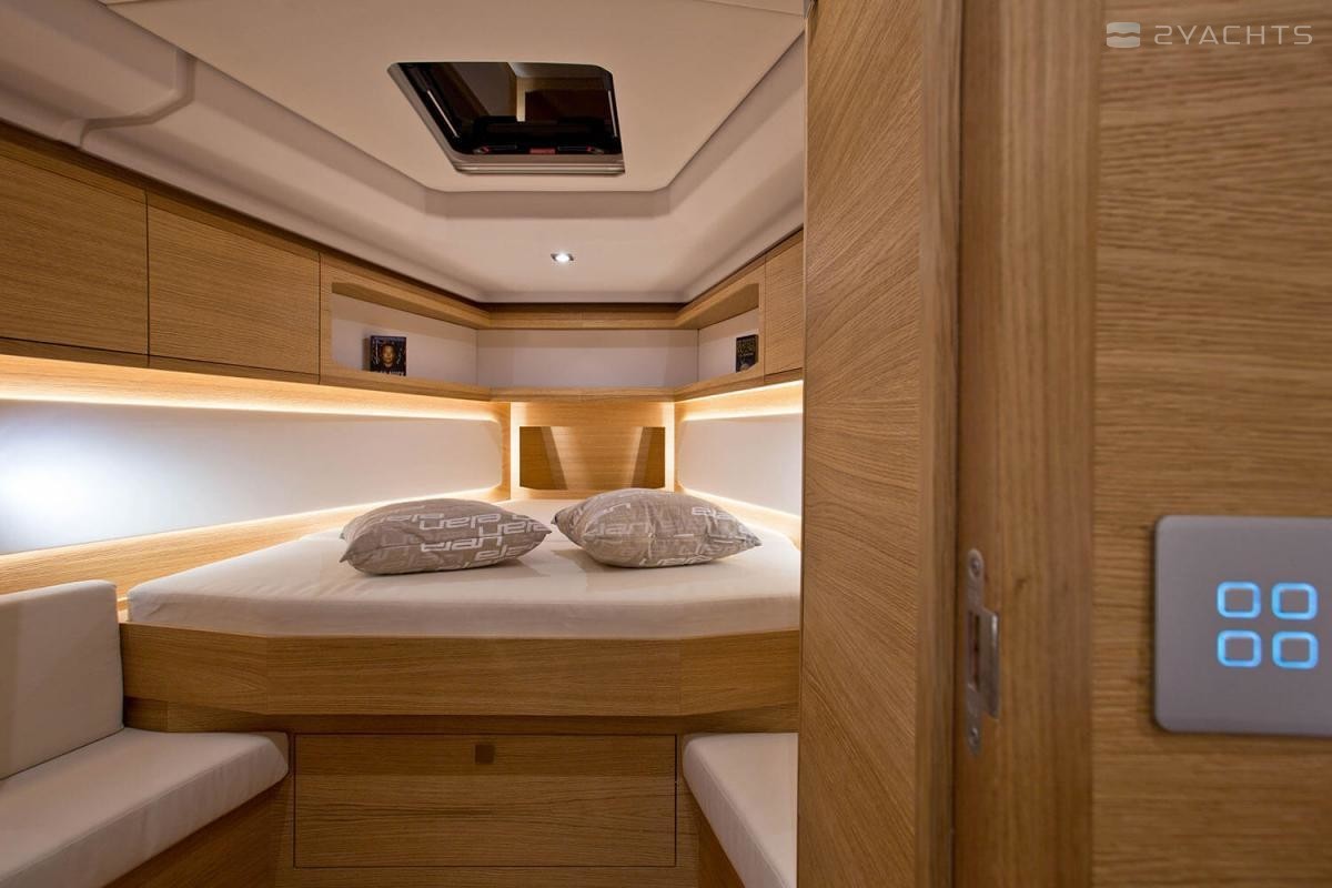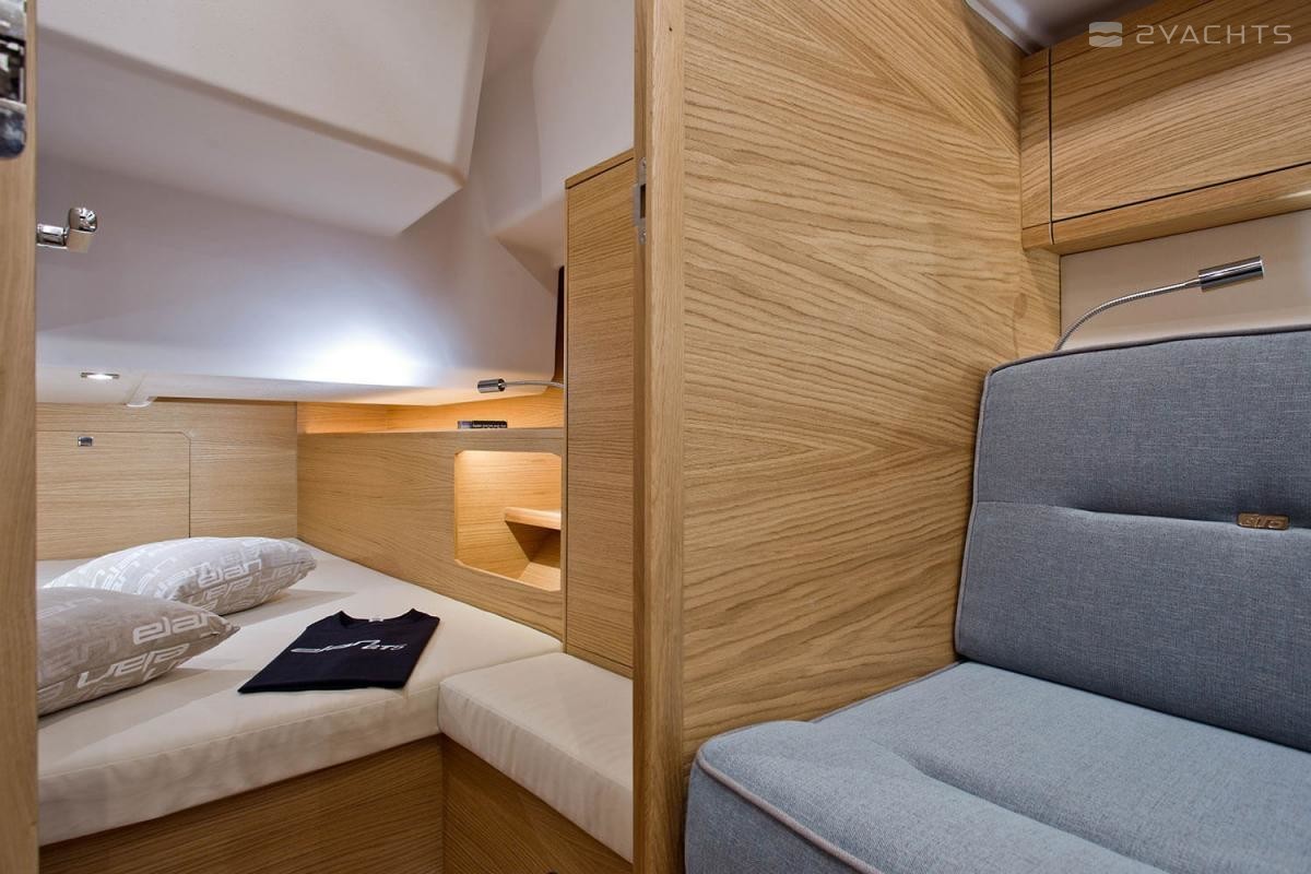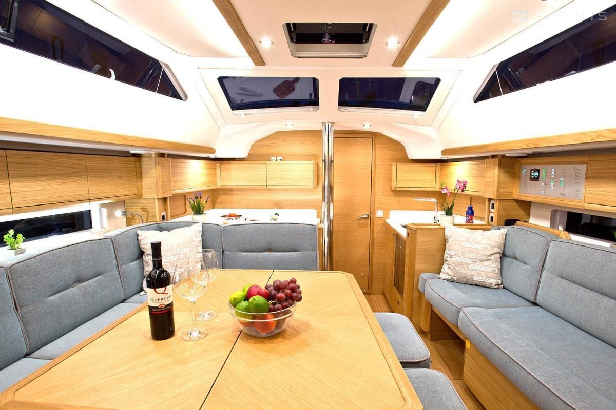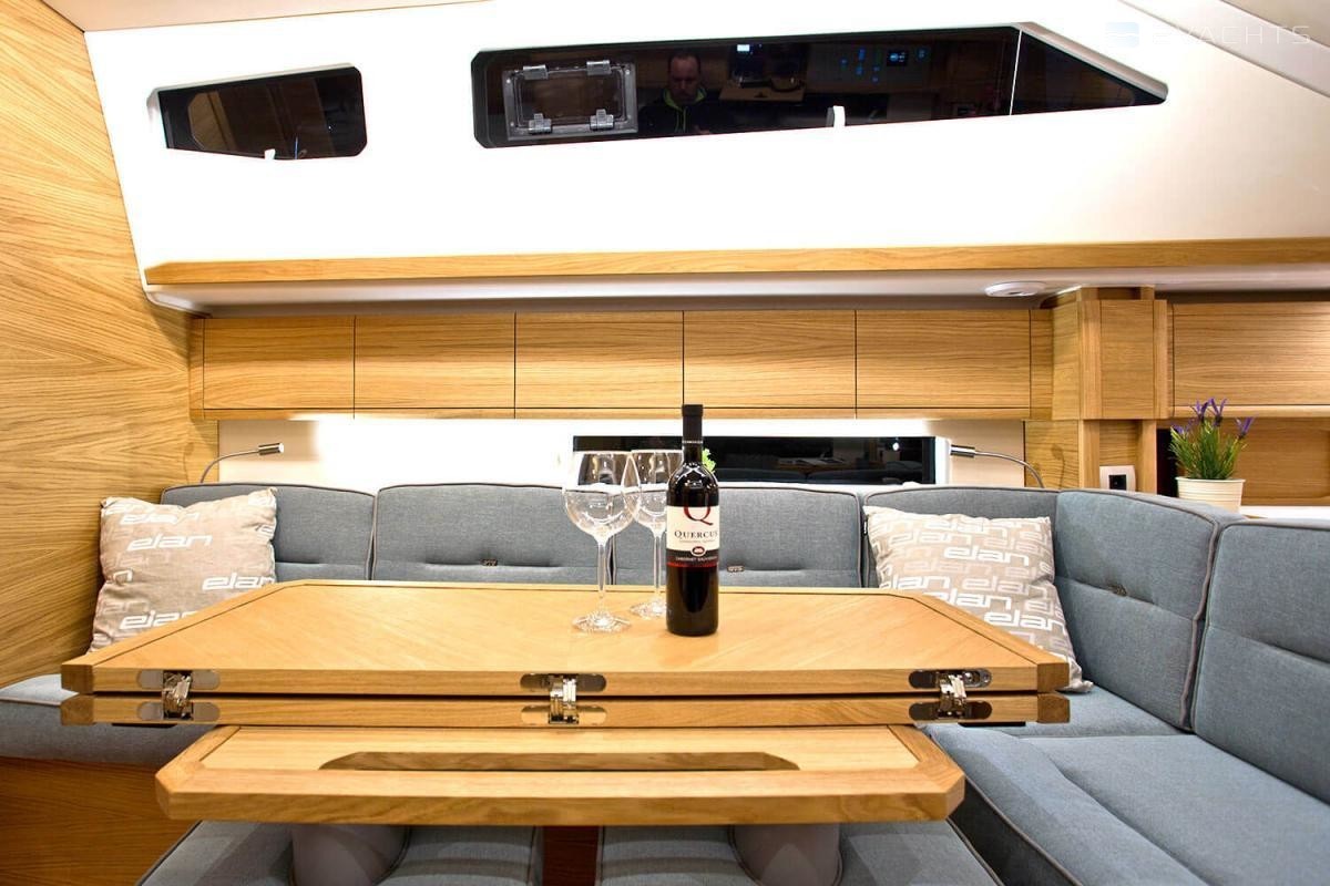 Elan GT5 Elégance et PeformanceAvec la plate-forme de baignade, les options de cuisine de cockpit avec un réfrigérateur, un grill et d'autres équipements habituels sur des yachts beaucoup plus grands, le cockpit GT5 est conçu pour jouir du temps passé en famille et avec les amis. Il offre une vaste surface d'assise et différentes options innovantes au niveau de la table de cockpit, dont la transformation des sièges en salon bain de soleil.Une conception épurée du pont assure un passage rapide et sûr vers l'avant et offre une multitude de zones bain de soleil avec des coussins adaptés sur le pont avant.L'espace sous le pont est totalement unique dans cette catégorie. L'équipe de conception Elan a mis en œuvre un aménagement de salon inversé avec la cuisine à l'avant, ce qui offre une utilisation optimale du volume du yacht pour apporter un niveau maximum de confort et d'innovation pour un salon de cette gamme de dimensions. L'avant de la cuisine offre un vaste espace de rangement avec un coin personnalisable à équiper individuellement par chaque propriétaire. Le puits de lumière panoramique à 180 degrés avec l'effet de fenêtre dans la fenêtre, deux trappes et une grande trappe centrale permettent une bonne ventilation du salon en permanence. Le nouveau modèle GT5 est également le seul yacht de cette taille à proposer un compartiment douche séparé avec un aménagement intérieur à 3 cabines et 2 cabinets de toilette