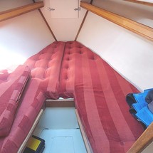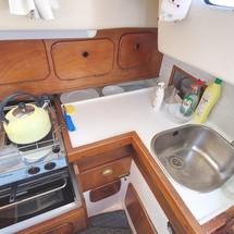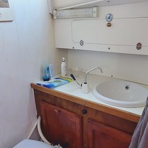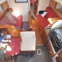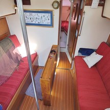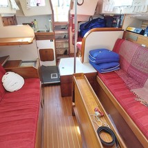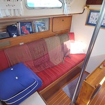 6 berths, 2 cabins, cloth upholstery, standing headroom, curtains, chart table, teak flooring, fold-down saloon table, Eberspacher diesel heating, sea toilet, china wash basin, Nelson gas cooker, stainless steel galley sink, fridge, pressurised cold water system.