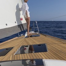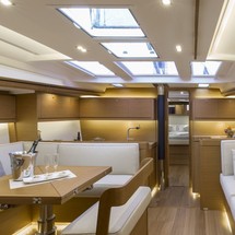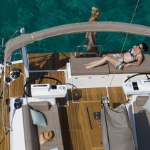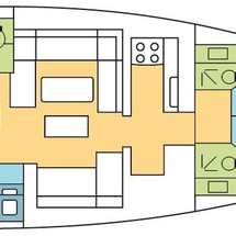 Boat equipment features classical mainsail, generator, bbq, bimini and bow thruster. It also boasts a heating, air conditioning, an audio system, outside speakers and inside speakers. The fully-equipped galley includes a microwave, oven, cooker, sink and kitchen utensils.
