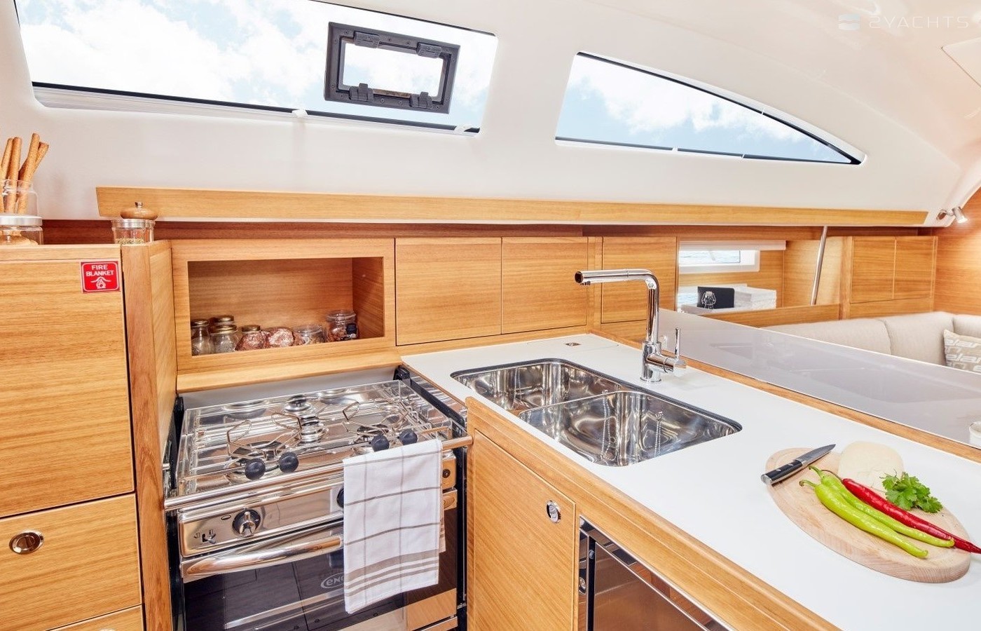 Boat equipment features rolling mainsail, bbq, bimini and bow thruster. It also boasts a heating, an audio system, outside speakers and inside speakers. The fully-equipped galley includes an oven, cooker, sink and kitchen utensils.
