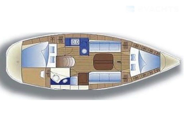 Boat equipment features rolling mainsail, salon gps plotter and bimini. It also boasts an an audio system and inside speakers. The fully-equipped galley includes an oven, cooker, sink and kitchen utensils.