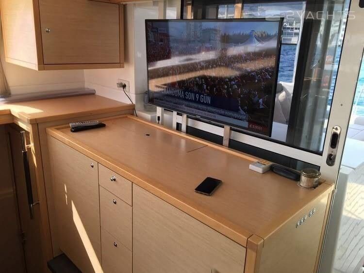 Boat equipment features classical mainsail, generator, bimini and outside gps plotter. It also boasts a flat screen tv, air conditioning, an audio system, dvd player and outside speakers. The fully-equipped galley includes an ice maker, freezer, oven, cooker and sink.