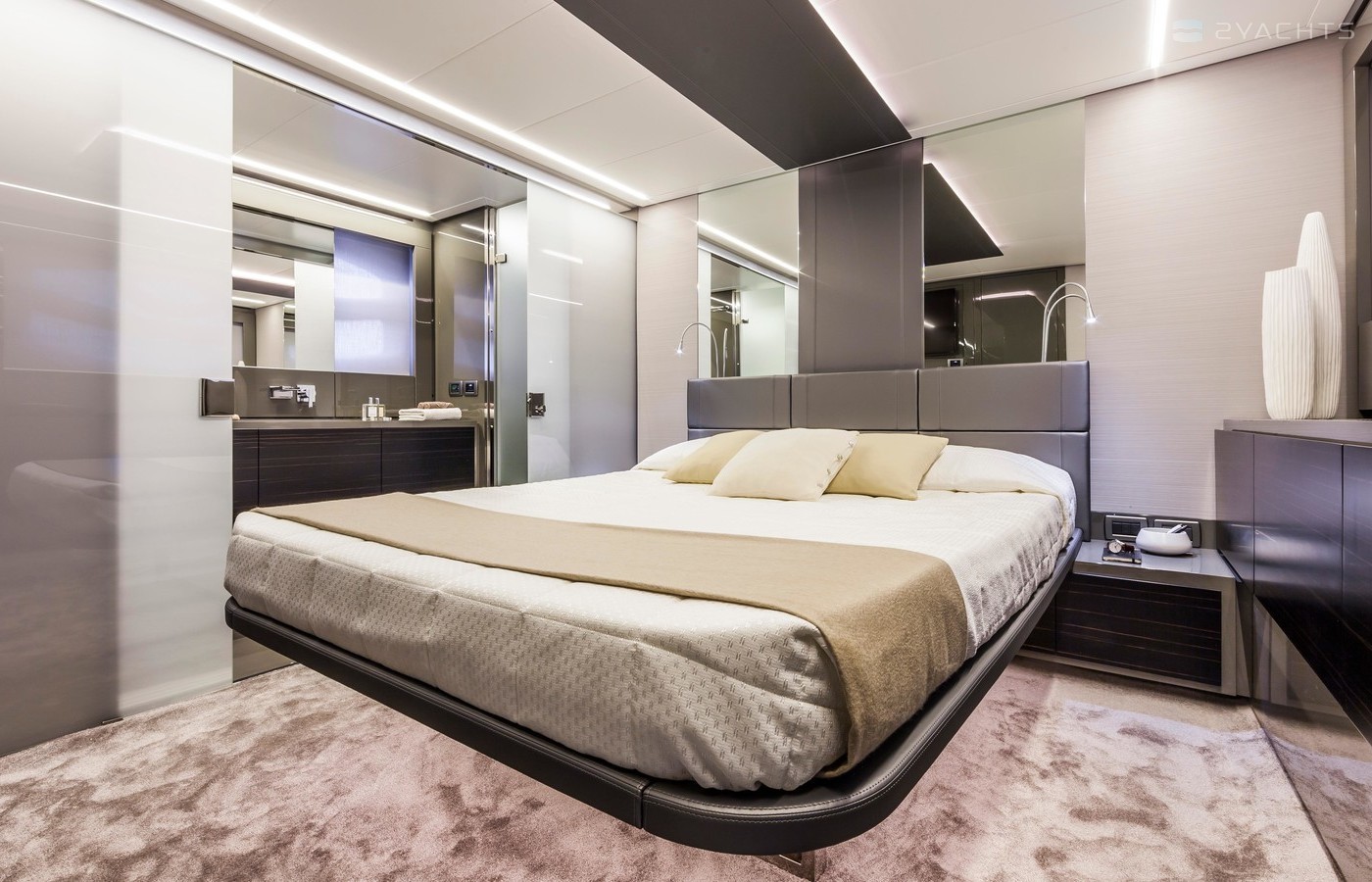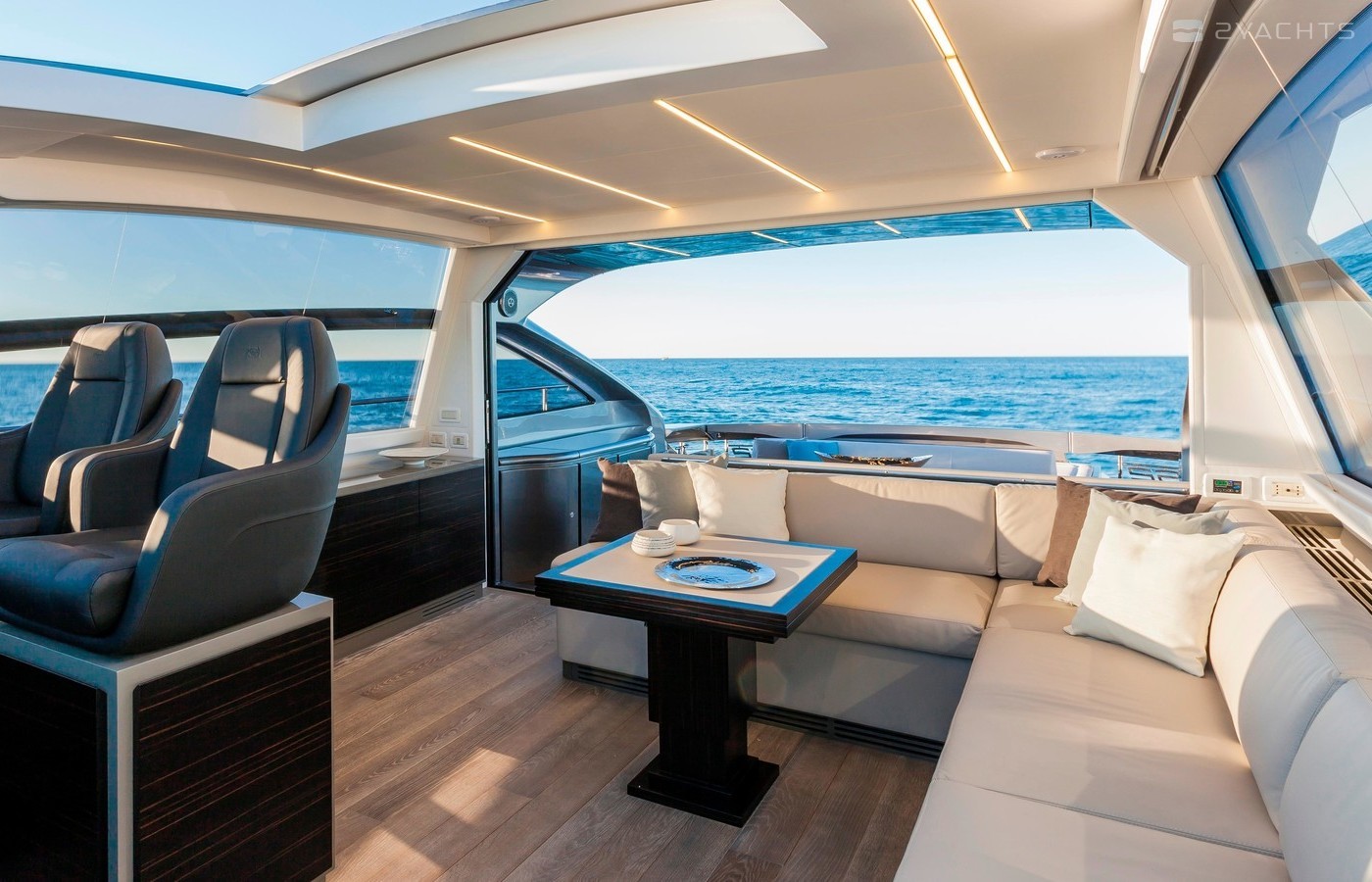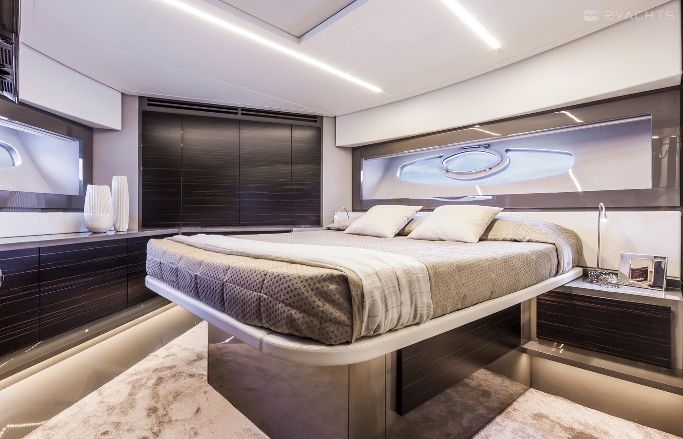 ThePershing 62 immediately grabs the attention for its sleek and slender profile: the hull line and the superstructure have indeed been designed to obtain a slim, fast yacht characterized by aggressive lines and a sporty personality, also thanks to the unique shape of the hull glazing. These windows in the hull are a typical feature in Pershing’s new era, which can now be found in this model too, preserving the family feeling and ensuring great brightness in the full-beam master cabin located amidships. The VIP cabin too benefits from two windows with portholes, providing plenty of natural light. The Pershing 62 is available with three cabins and three heads with separate shower box in the master stateroom.