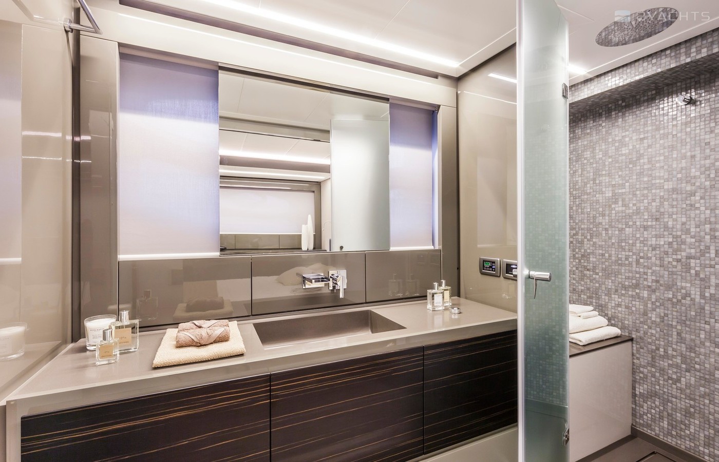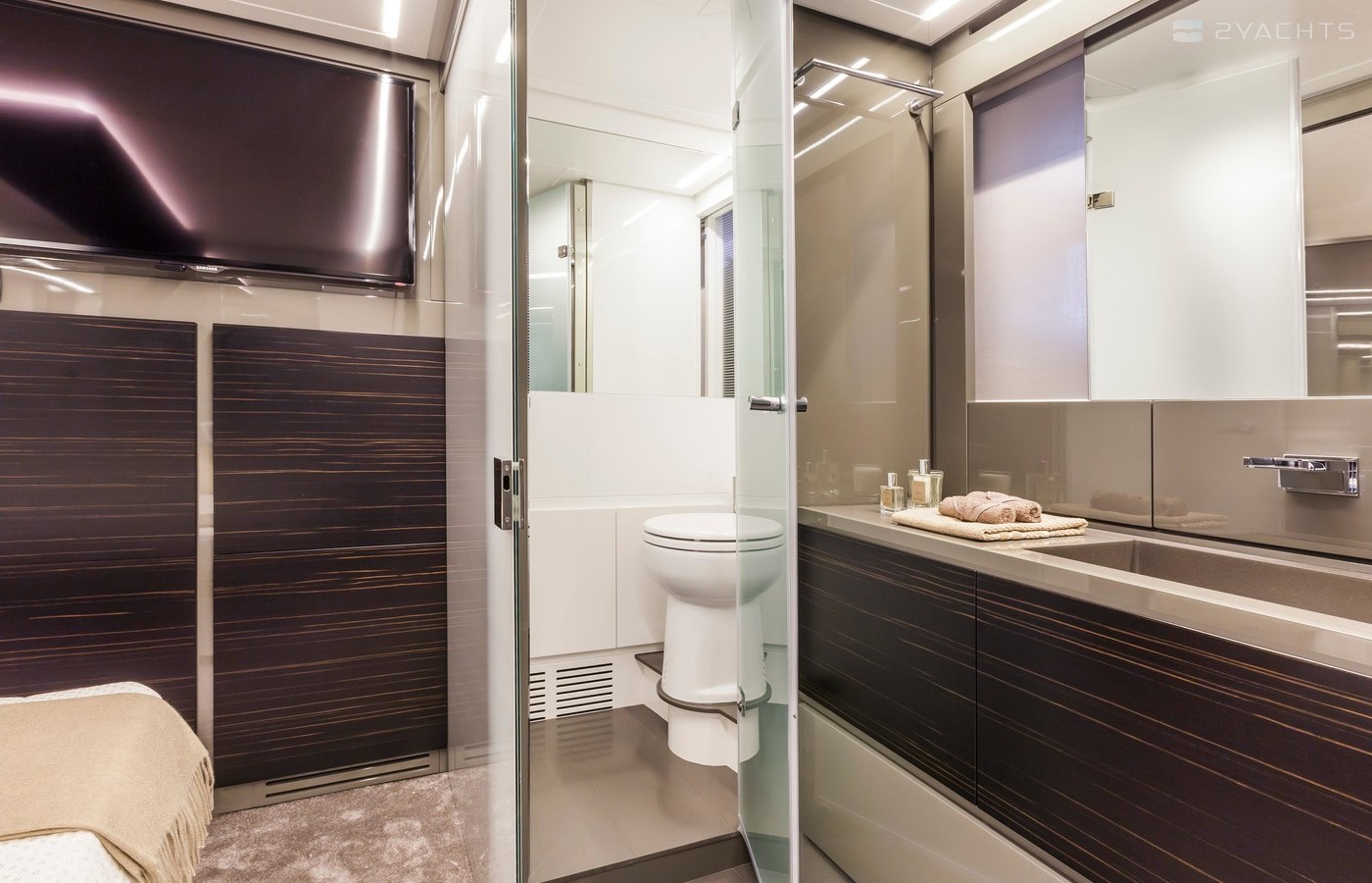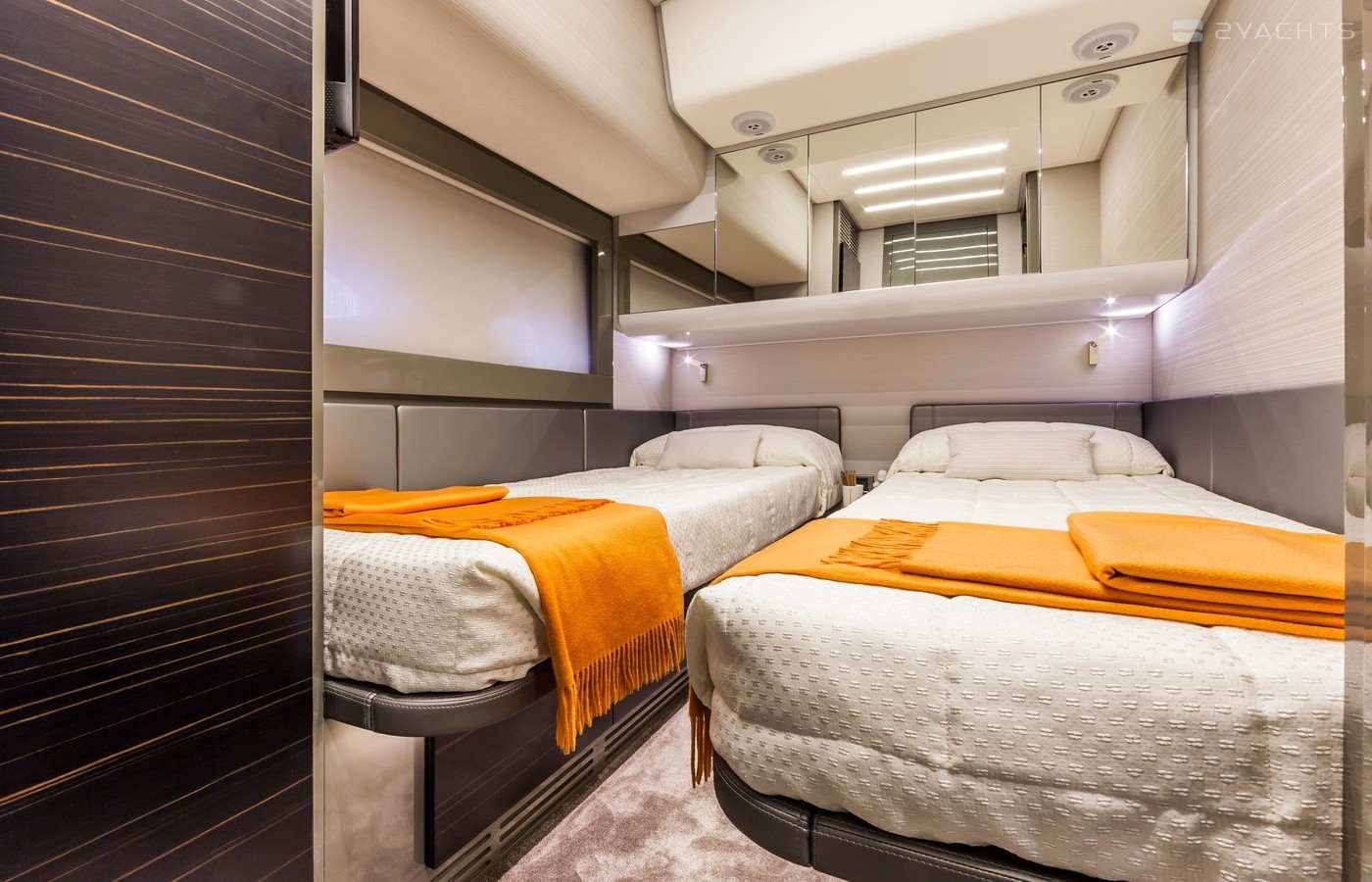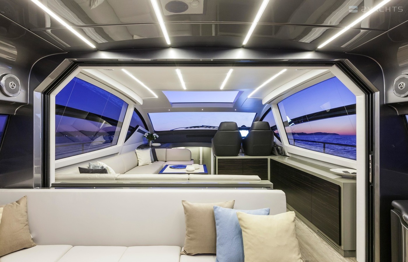 ThePershing 62 immediately grabs the attention for its sleek and slender profile: the hull line and the superstructure have indeed been designed to obtain a slim, fast yacht characterized by aggressive lines and a sporty personality, also thanks to the unique shape of the hull glazing. These windows in the hull are a typical feature in Pershing’s new era, which can now be found in this model too, preserving the family feeling and ensuring great brightness in the full-beam master cabin located amidships. The VIP cabin too benefits from two windows with portholes, providing plenty of natural light. The Pershing 62 is available with three cabins and three heads with separate shower box in the master stateroom.
