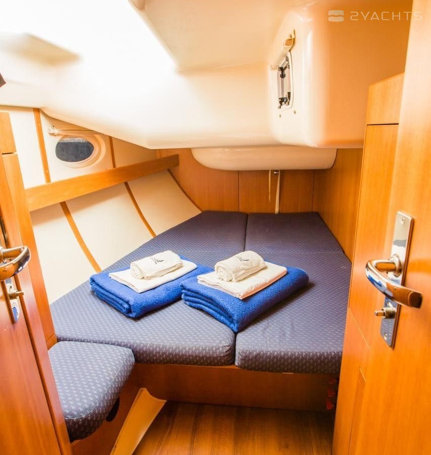 Jordan can accommodate up to 10 people in 3 double cabins, 1 double cabin with a bunk bed and a saloon with 2 extra beds. Pillows and blankets are included in the price.