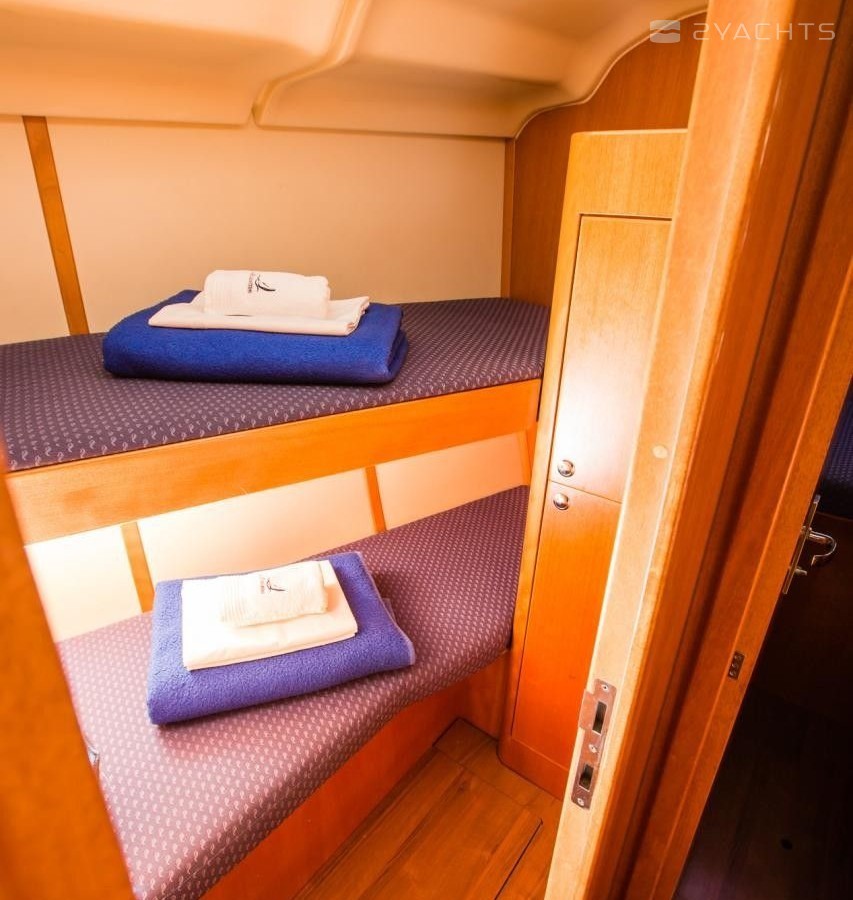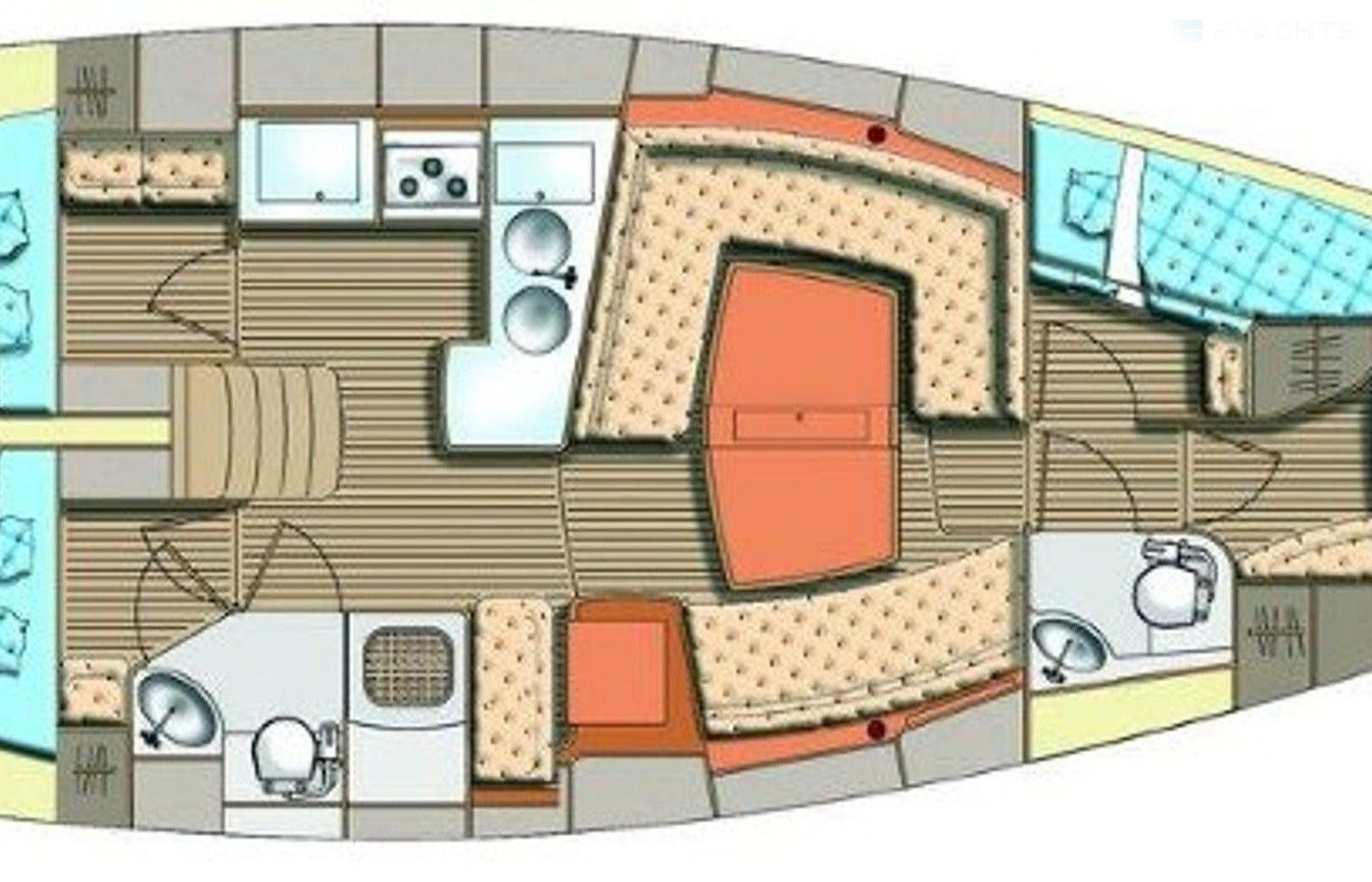 Boat equipment features classical mainsail, solar panels, salon gps plotter, bimini and bow thruster. It also boasts a flat screen tv, heating, an audio system, dvd player and outside speakers. The fully-equipped galley includes a microwave, oven, cooker, sink and kitchen utensils.