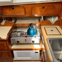 Two burner propane stove, 120volt microwave oven, stainless steel sink, several storage units