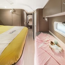 Boat equipment features classical mainsail, solar panels, generator, bimini and outside gps plotter. It also boasts a heating, air conditioning, an audio system, outside speakers and flybridge. The fully-equipped galley includes a freezer, oven, cooker, sink and kitchen utensils.