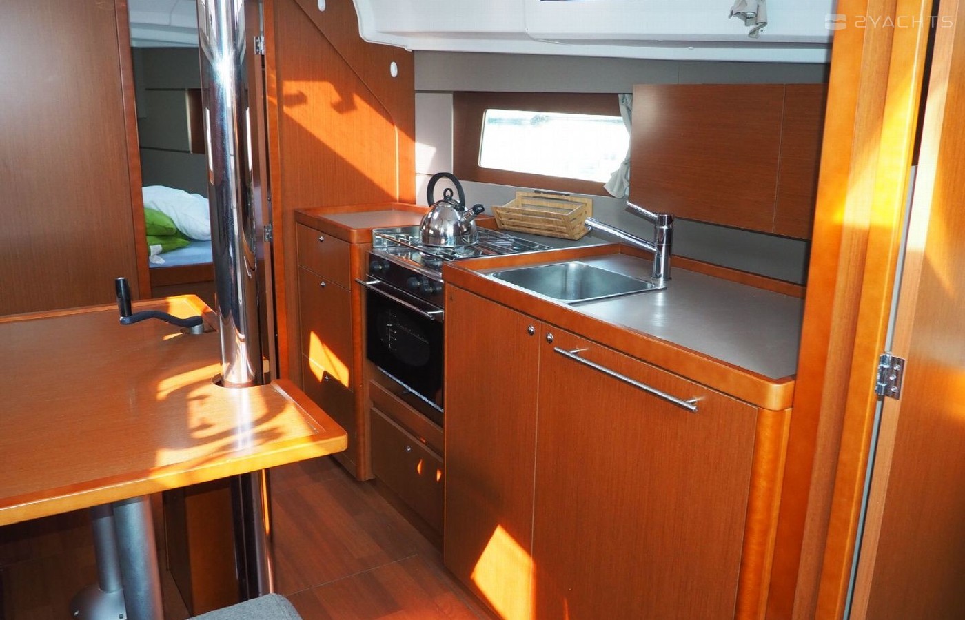 Boat equipment features Classical mainsail, Bimini and Outside GPS plotter. It also boasts an Audio system, Outside speakers and Inside speakers. The fully-equipped galley includes Oven, Cooker, Sink and Kitchen utensils.