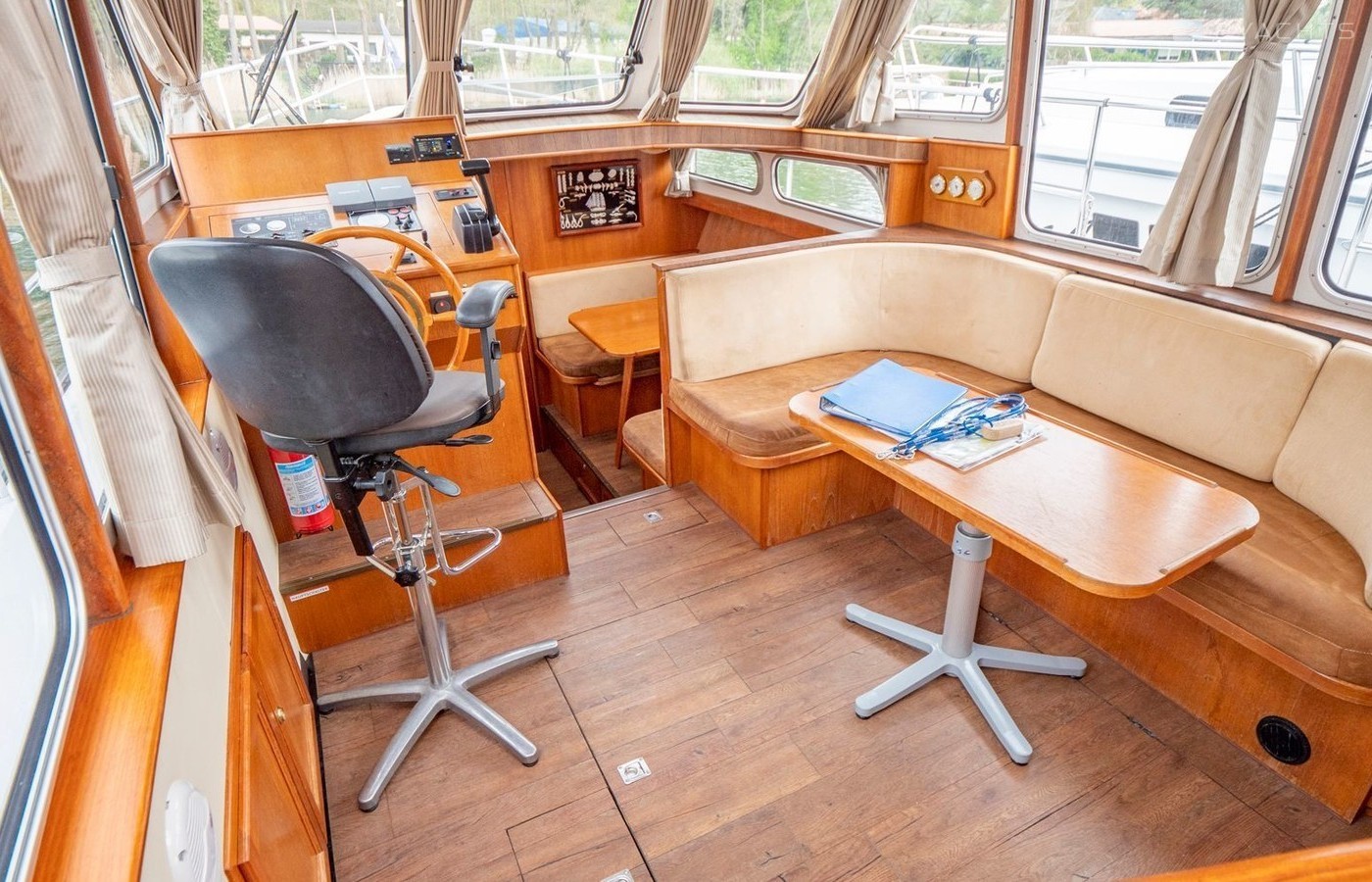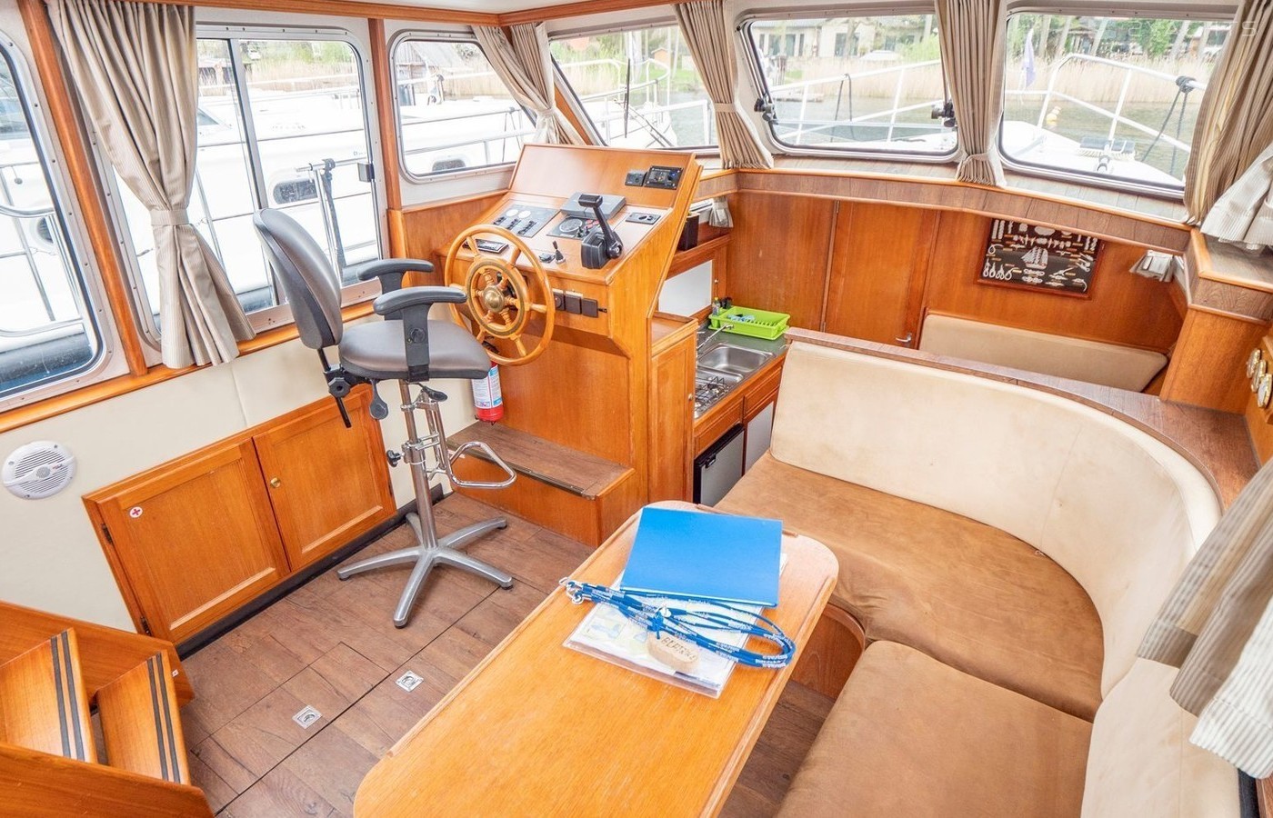 This houseboat is equipped with bimini and bow thruster. In chilly weather, guests will benefit from heating. flat screen tv, an audio system and inside speakers are also available.