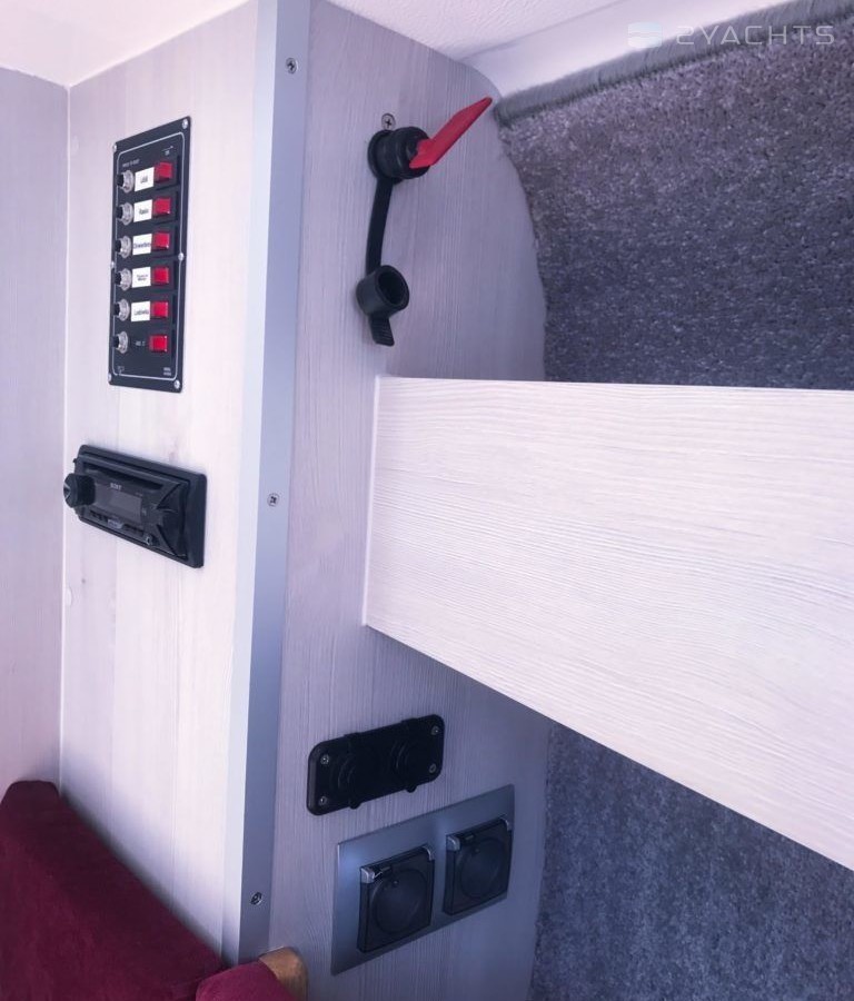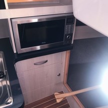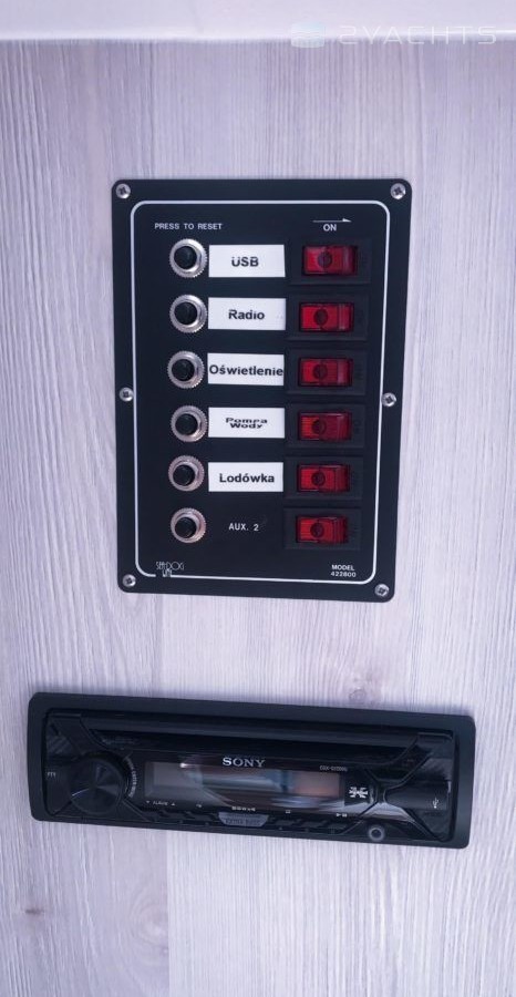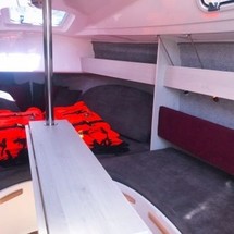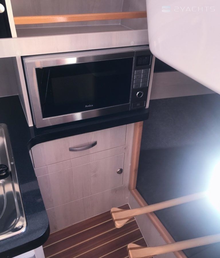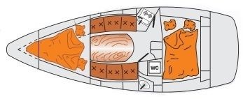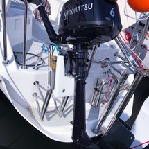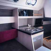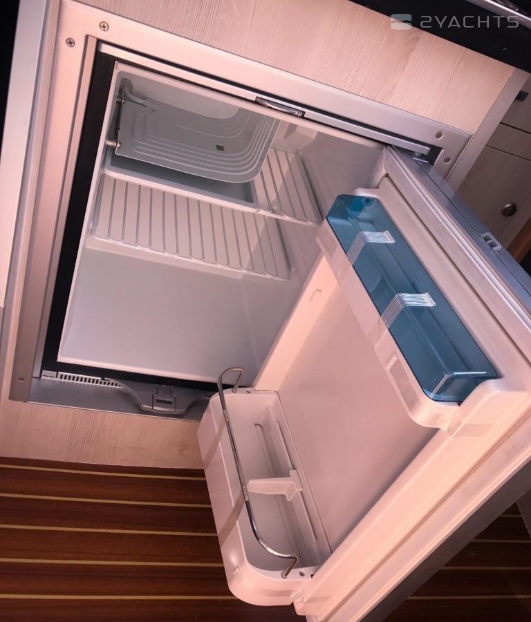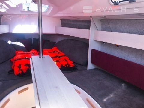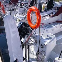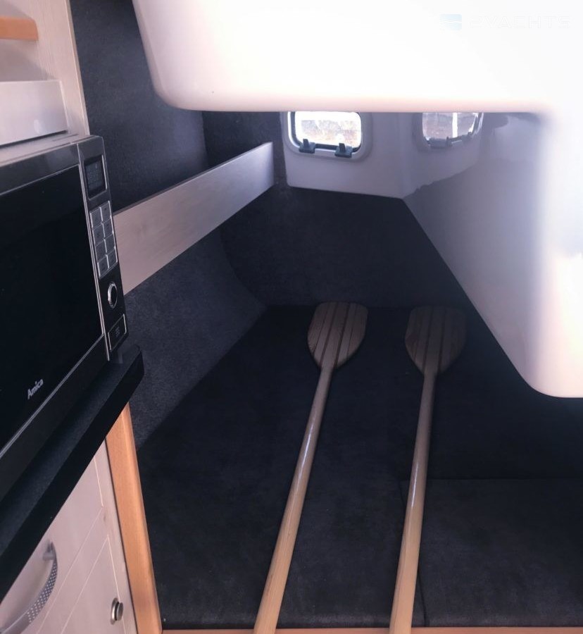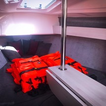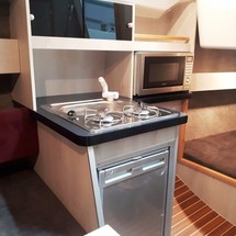 Boat equipment features classical mainsail. It also boasts a heating, an audio system and inside speakers. The fully-equipped galley includes a microwave, cooker, sink and kitchen utensils.