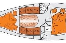 Elcia can accommodate up to 6 people in 2 double cabins and 2 double cabins with a bunk bed.