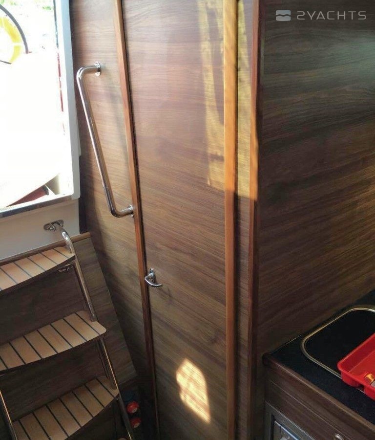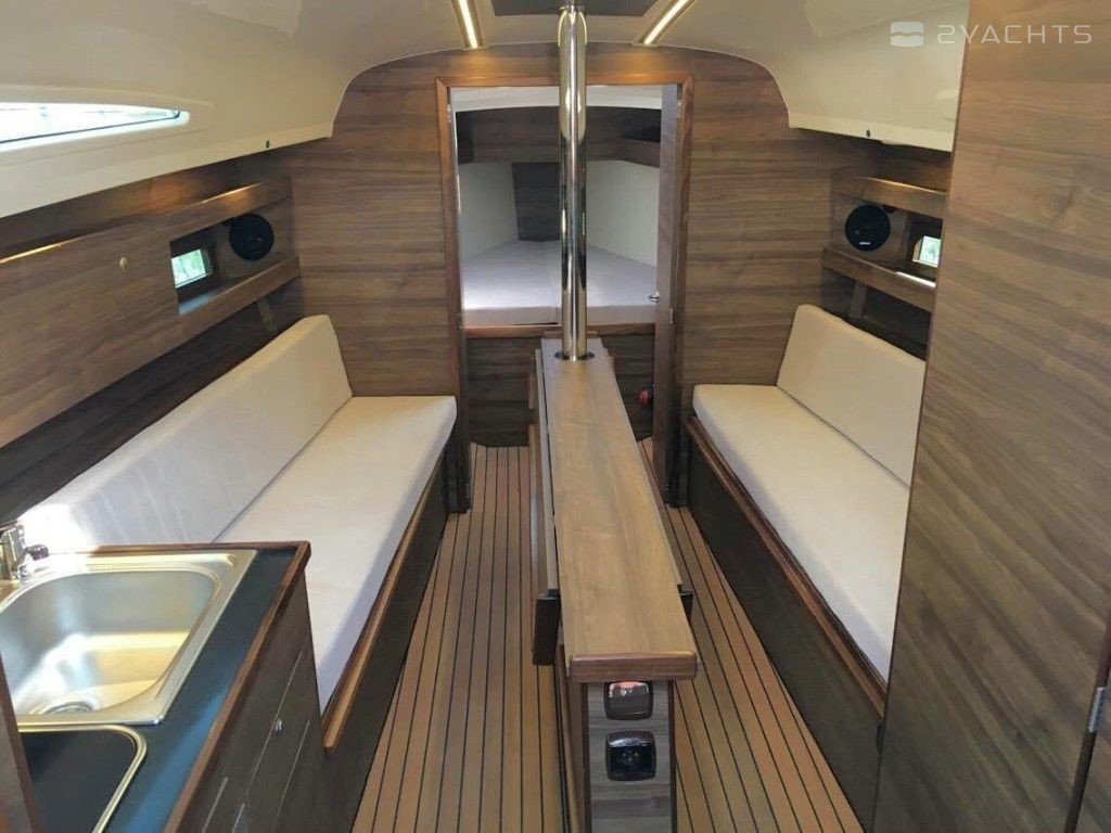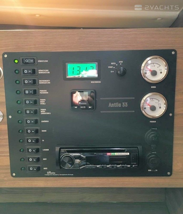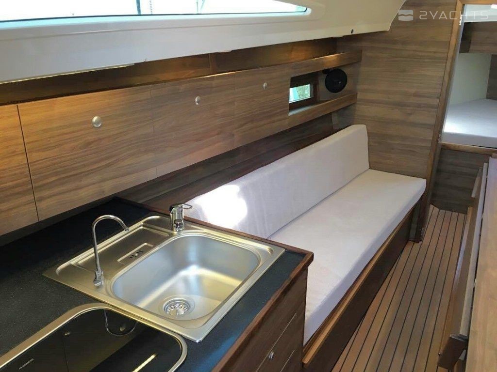Boat equipment features classical mainsail, bimini and bow thruster. It also boasts a heating, an audio system, outside speakers and inside speakers. The fully-equipped galley includes a freezer, cooker, sink and kitchen utensils.