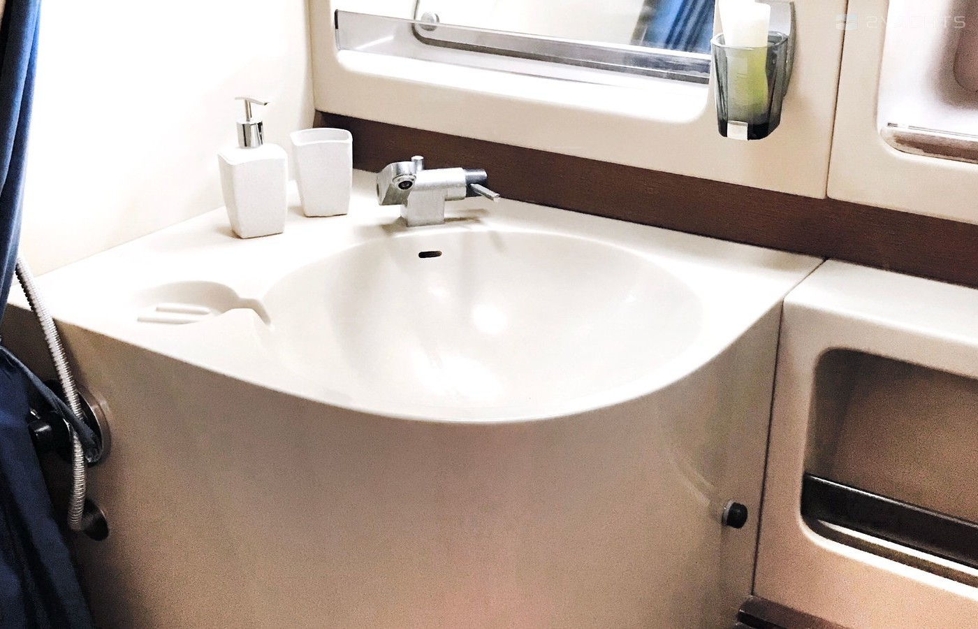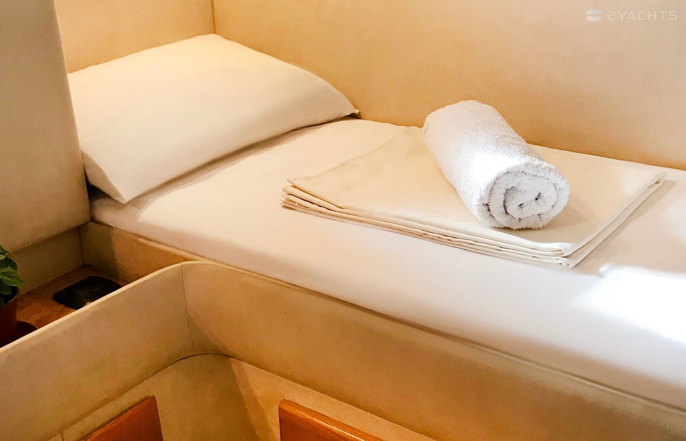 Dim can accommodate up to 4 people in 1 double cabin, 1 double cabin with a bunk bed and a saloon with 1 extra bed.