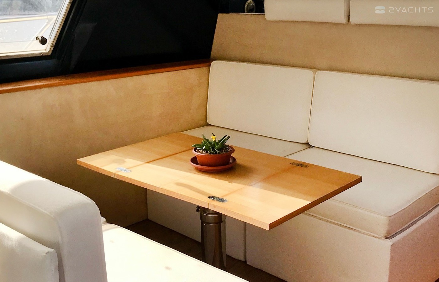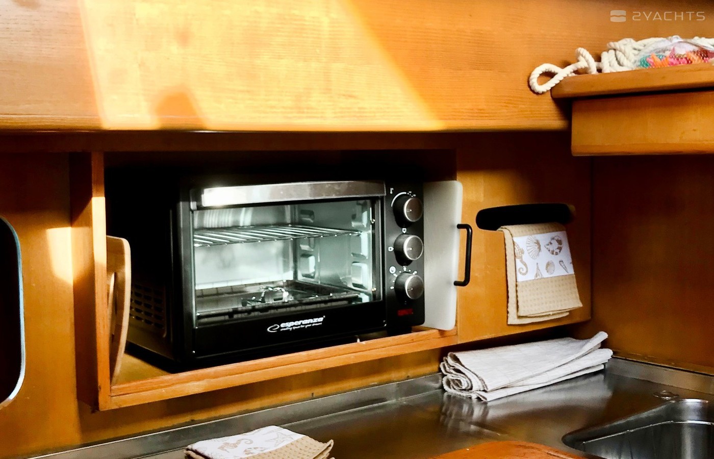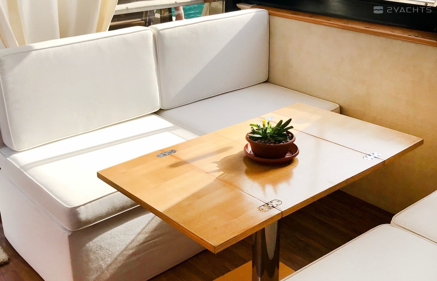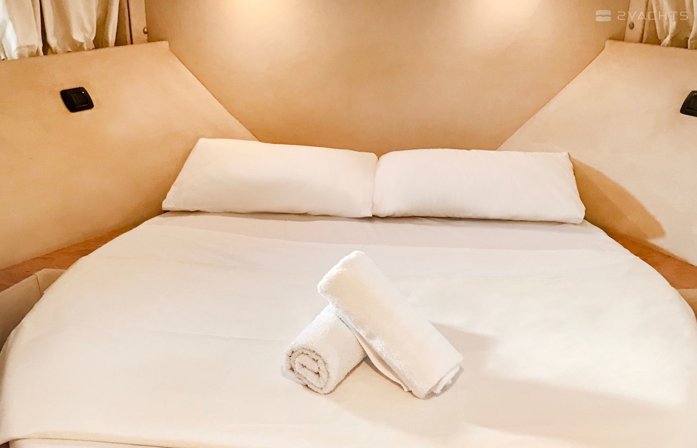 Boat equipment features solar panels, radar, generator, salon gps plotter and bimini. It also boasts a flat screen tv, an audio system, outside speakers, flybridge and free stand up paddleboard. The fully-equipped galley includes a freezer, coffee machine, oven, cooker and sink.