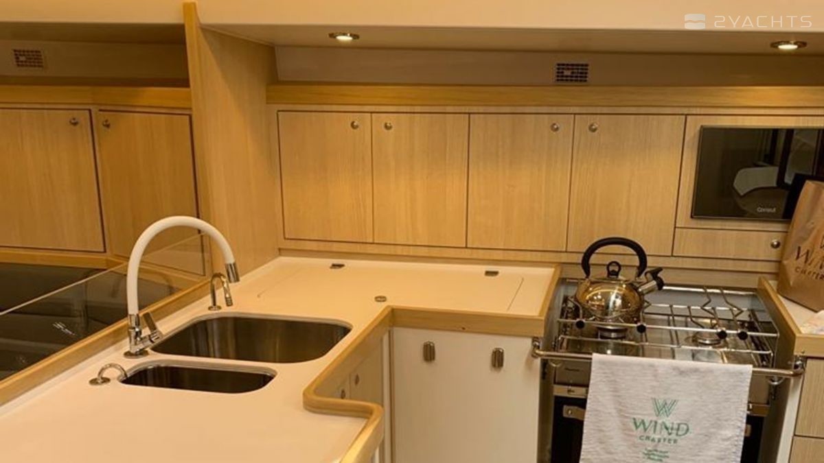Boat equipment features classical mainsail, solar panels, generator, salon gps plotter, bbq and bimini. It also boasts a heating, air conditioning, an audio system, outside speakers and inside speakers. The fully-equipped galley includes an oven, cooker, sink and kitchen utensils.