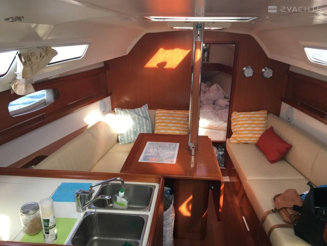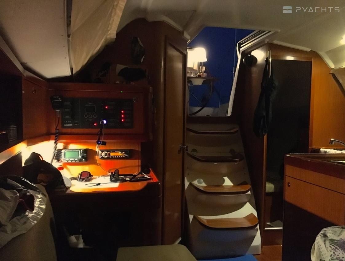 Boat equipment features classical mainsail and outside gps plotter. It also boasts an an audio system and inside speakers. The fully-equipped galley includes an oven, cooker, sink and kitchen utensils.