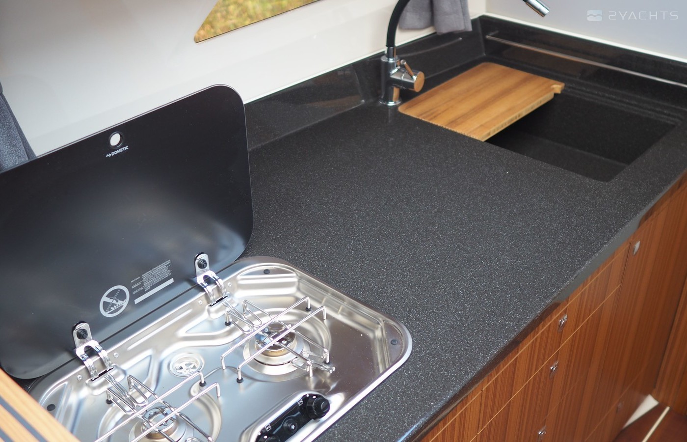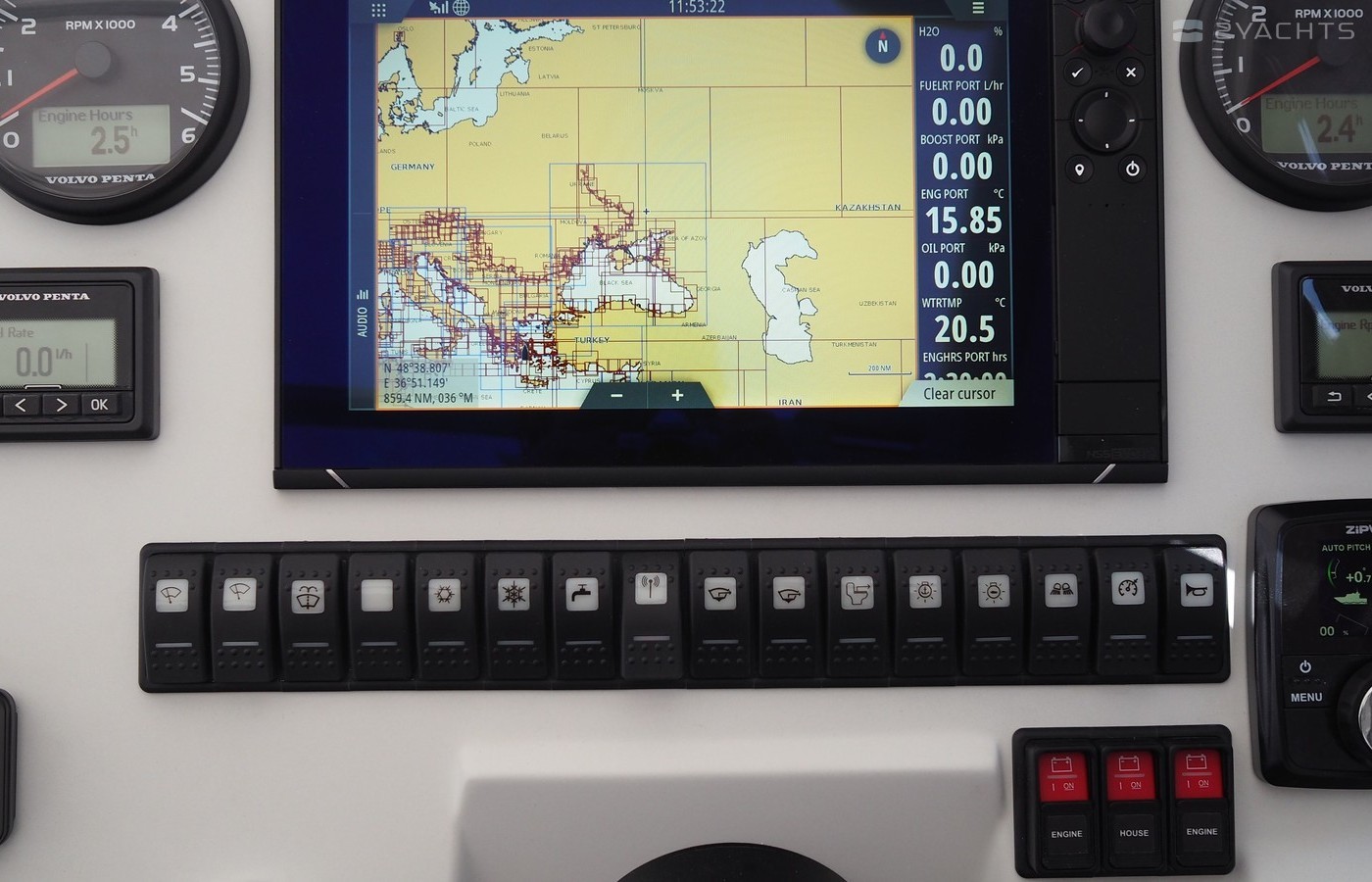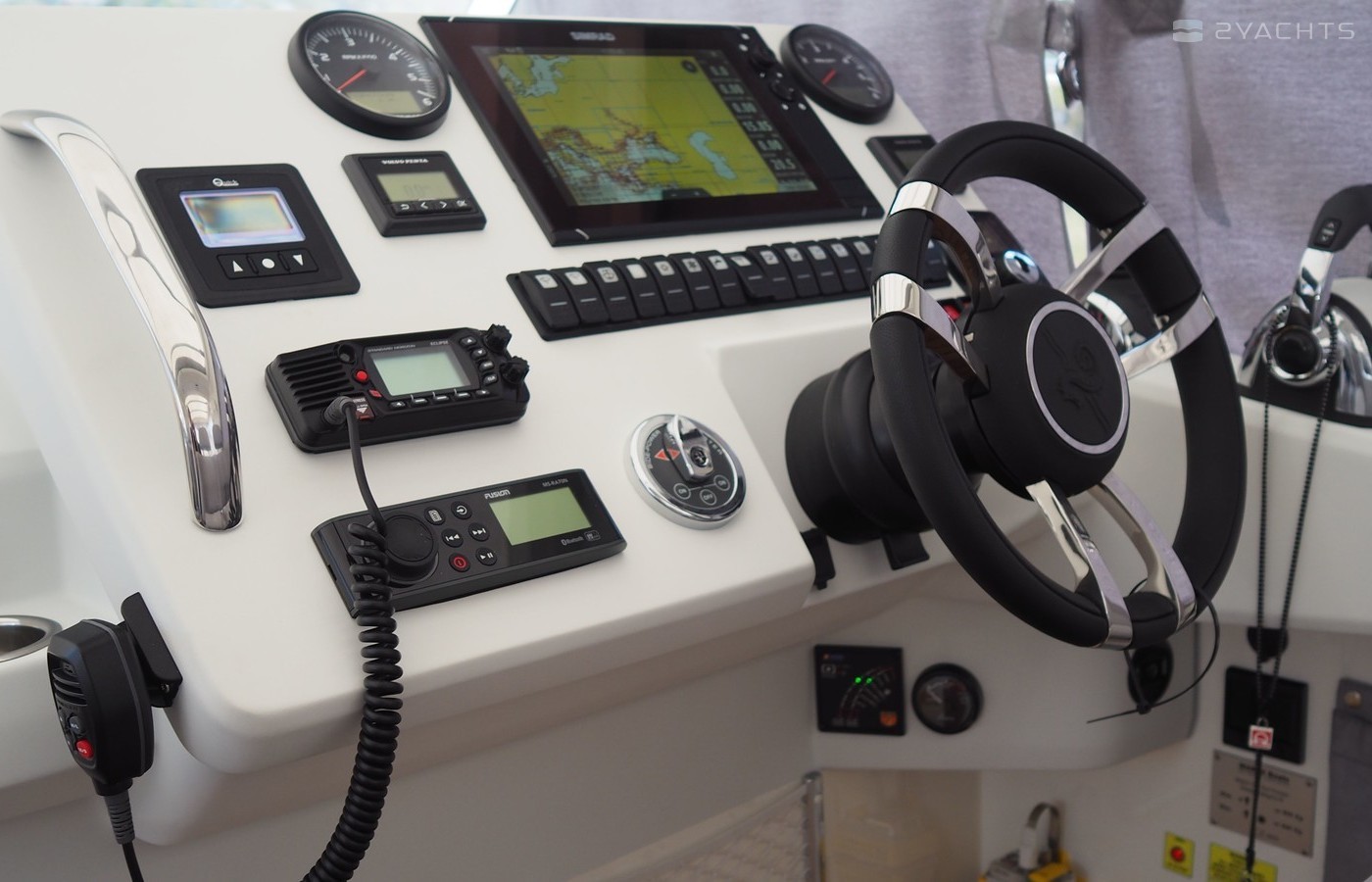 Boat equipment features solar panels, salon gps plotter, bimini and bow thruster. It also boasts a heating, air conditioning, an audio system, outside speakers and inside speakers. The fully-equipped galley includes a freezer, cooker, sink and kitchen utensils.