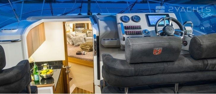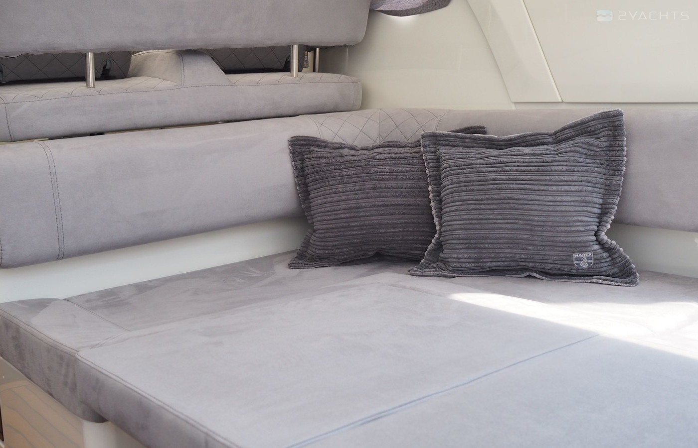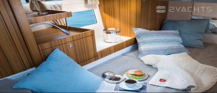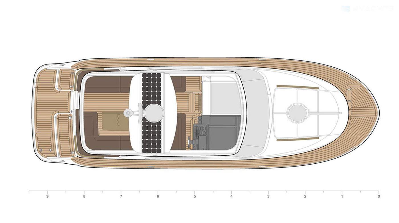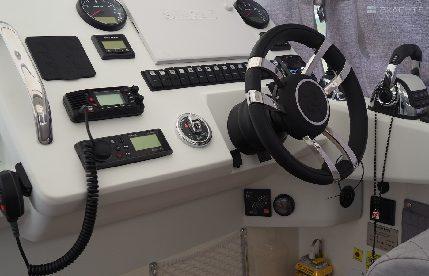 Boat equipment features solar panels, salon gps plotter, bimini and bow thruster. It also boasts a heating, air conditioning, an audio system, outside speakers and inside speakers. The fully-equipped galley includes a freezer, cooker, sink and kitchen utensils.