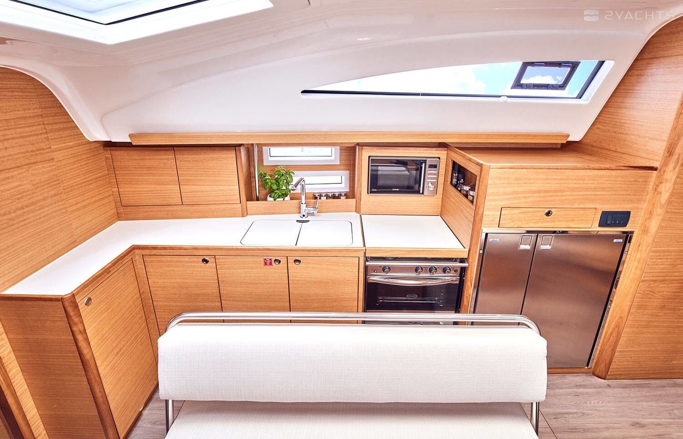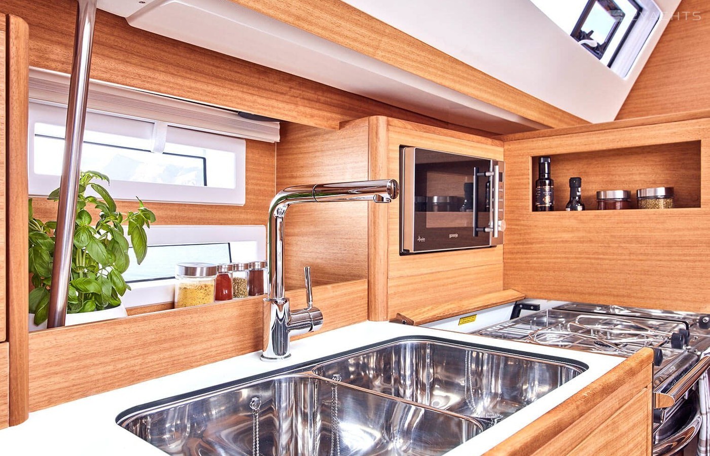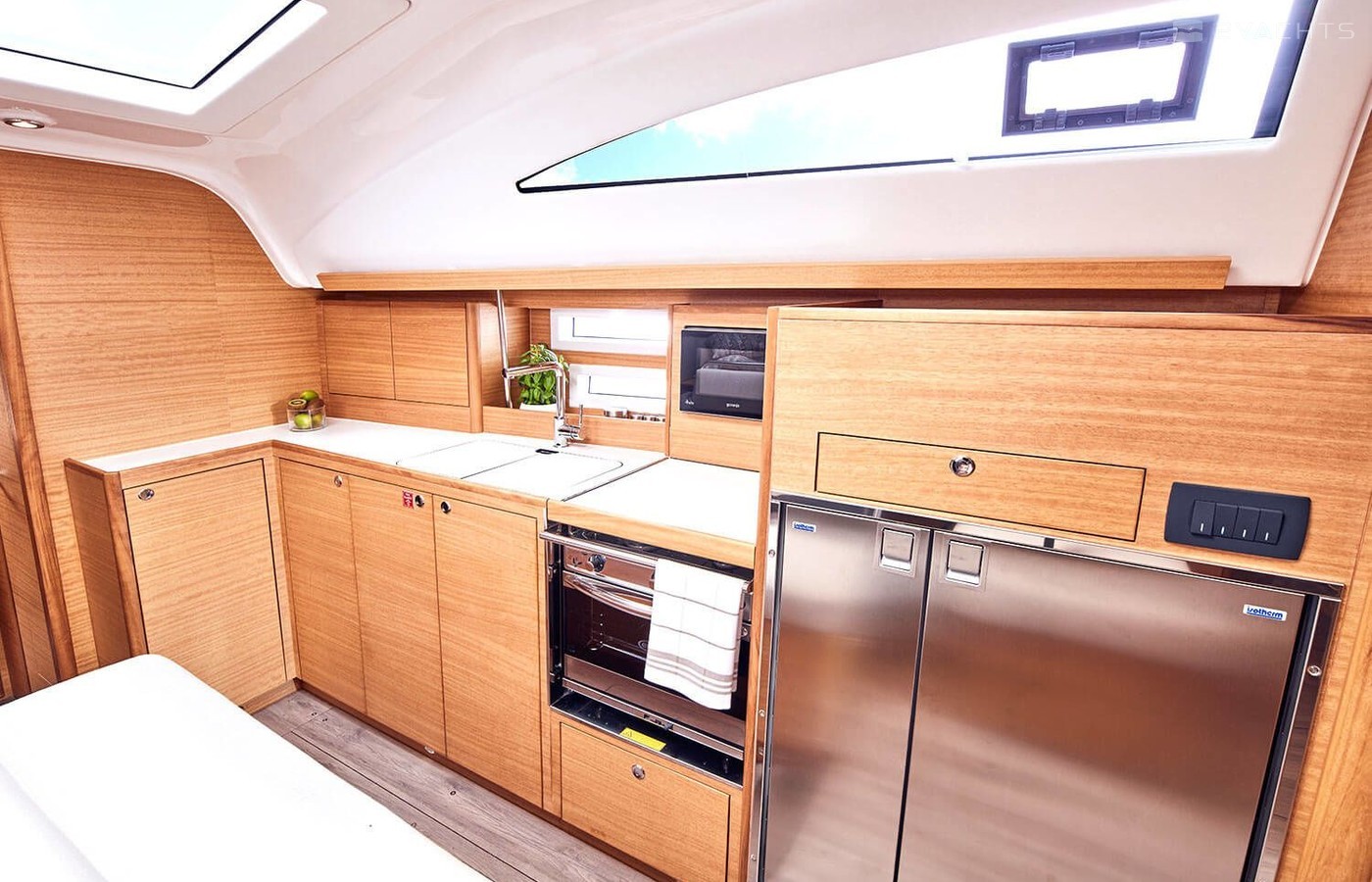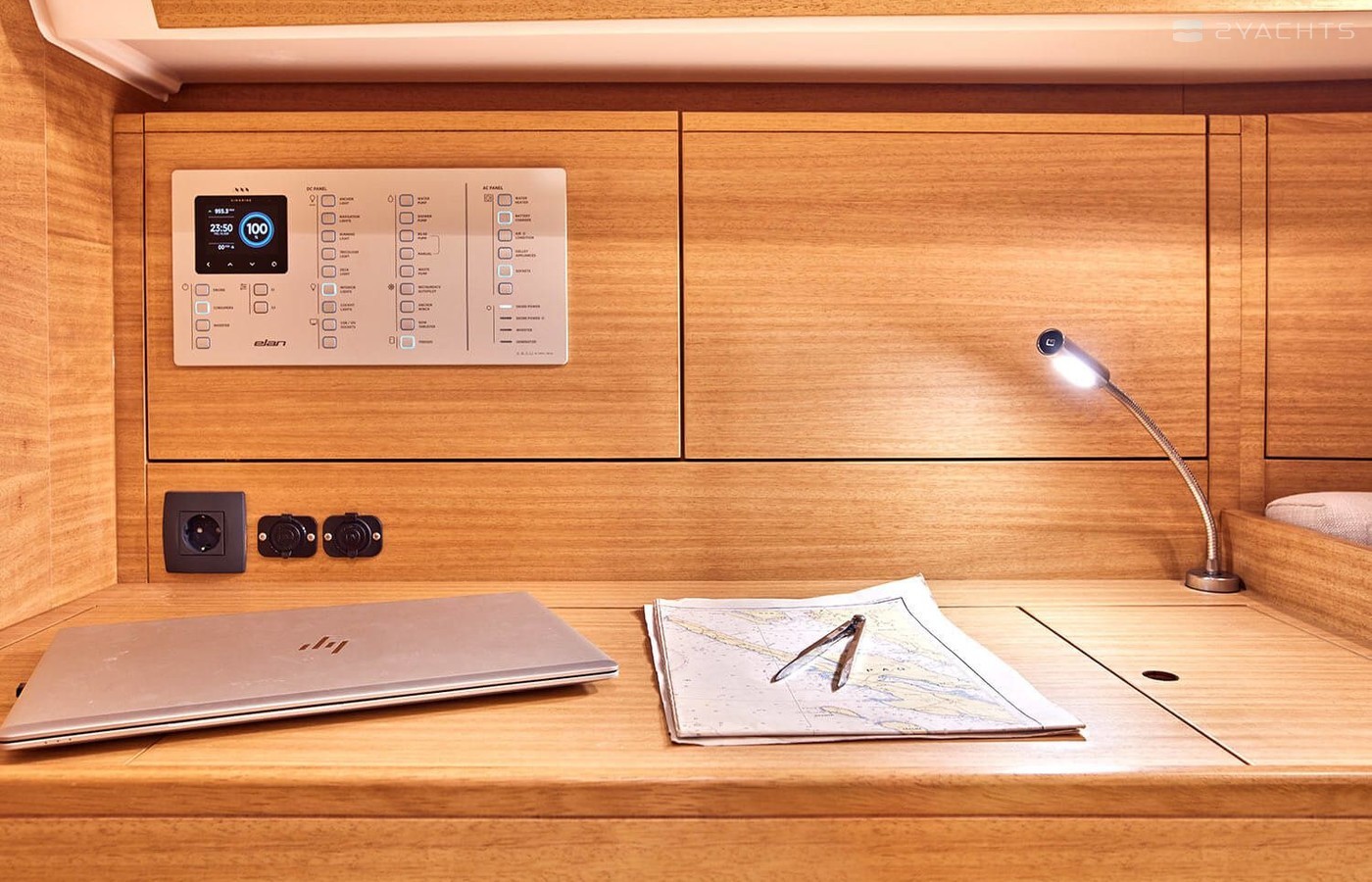 Boat equipment features classical mainsail, bbq, bimini and bow thruster. It also boasts a heating, an audio system, outside speakers and inside speakers. The fully-equipped galley includes a freezer, oven, cooker, sink and kitchen utensils.