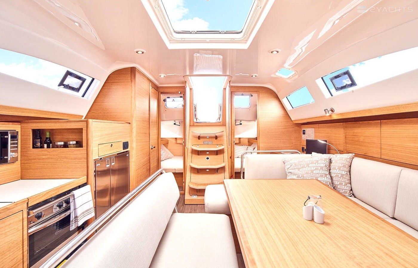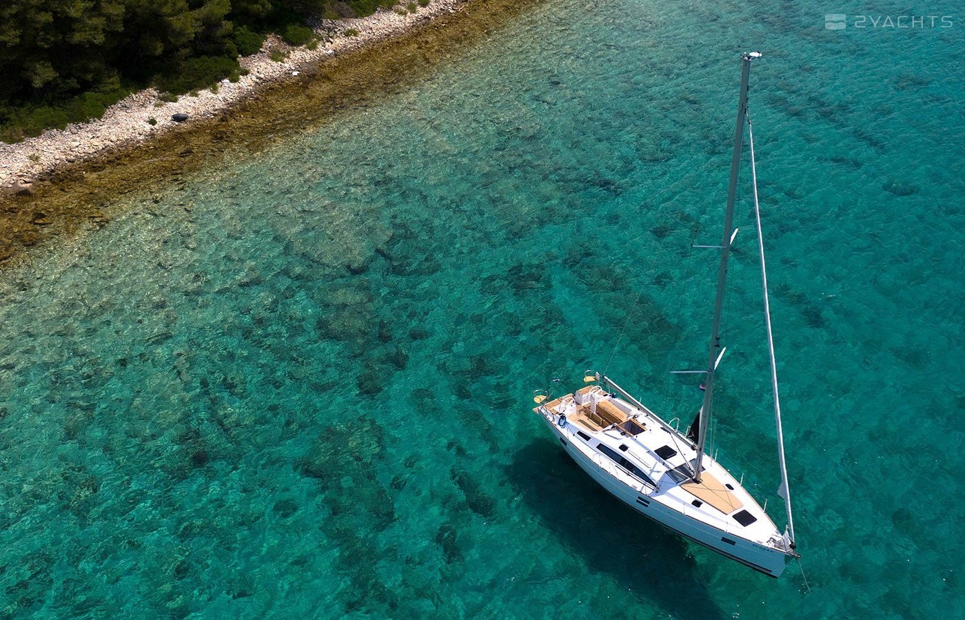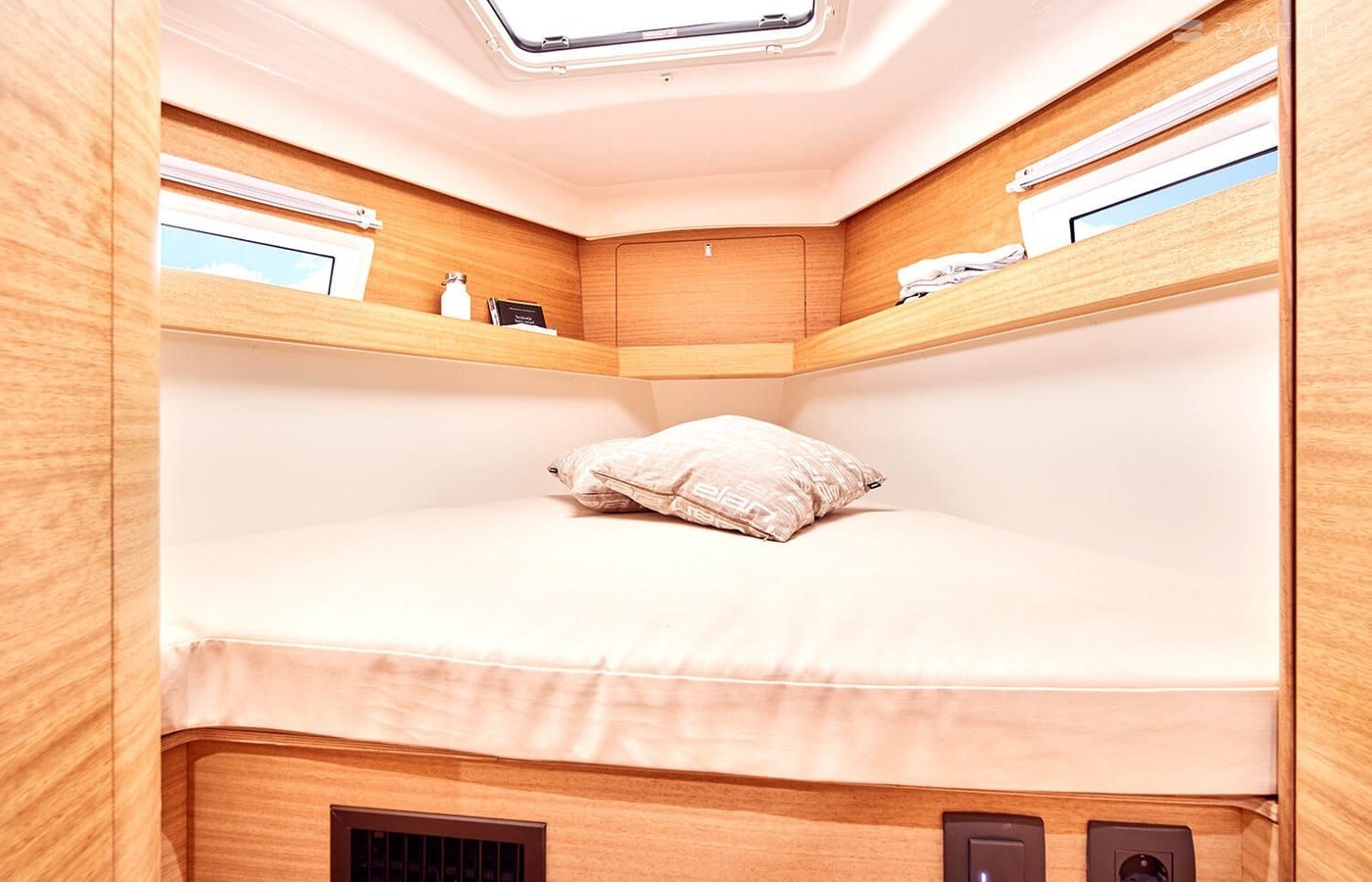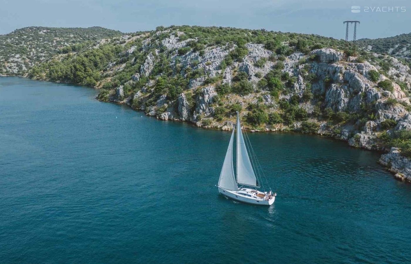 Boat equipment features classical mainsail, bbq, bimini and bow thruster. It also boasts a heating, an audio system, outside speakers and inside speakers. The fully-equipped galley includes a freezer, oven, cooker, sink and kitchen utensils.