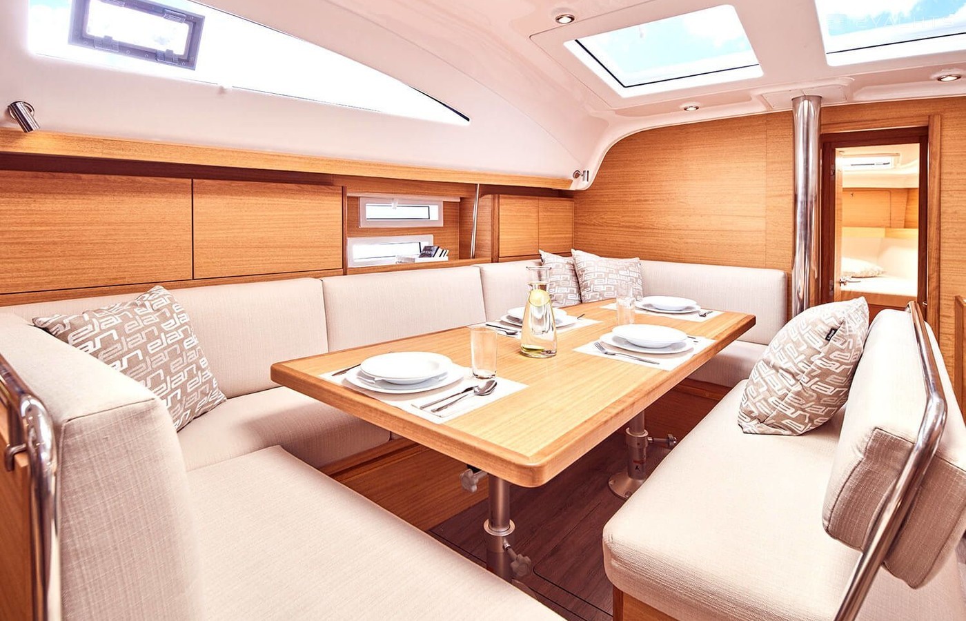 New can accommodate up to 10 people in 3 double cabins, 1 double cabin with a bunk bed and a saloon with 2 extra beds. Pillows and blankets are included in the price.