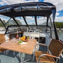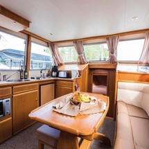 This houseboat is equipped with bimini and bow thruster. In chilly weather, guests will benefit from heating. flat screen tv, an audio system and inside speakers are also available.