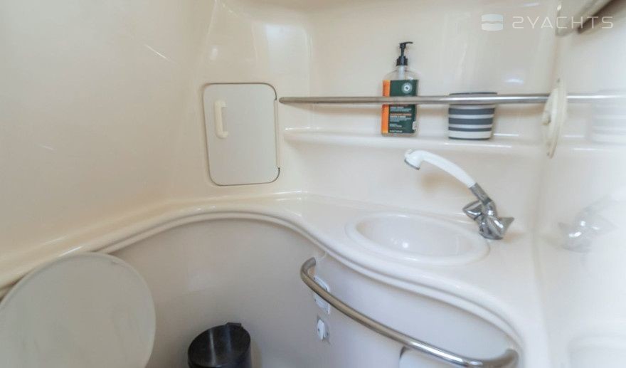 Boat equipment features generator, bimini and outside gps plotter. It also boasts a heating, air conditioning, an audio system, outside speakers and inside speakers. The fully-equipped galley includes a microwave, freezer, cooker, sink and kitchen utensils.