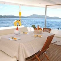 Boat equipment features classical mainsail, electric winches, generator, bimini and outside gps plotter. It also boasts a heating, air conditioning, an audio system, outside speakers and flybridge. The fully-equipped galley includes a microwave, freezer, coffee machine, oven and cooker.