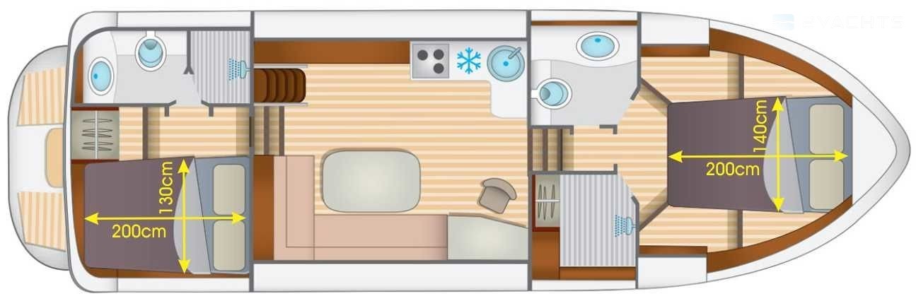 The living area of this houseboat consists of 2 cabins and accommodates 6 people. A shower is at the guests' disposal and there are 2 toilets on board.
