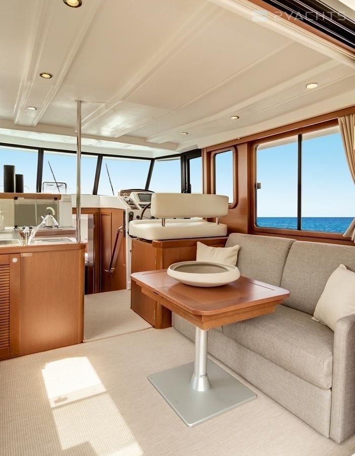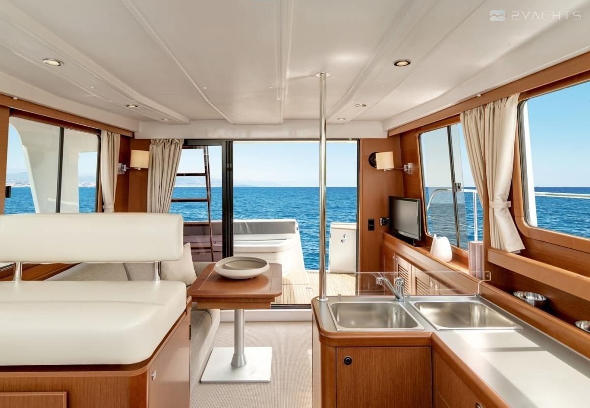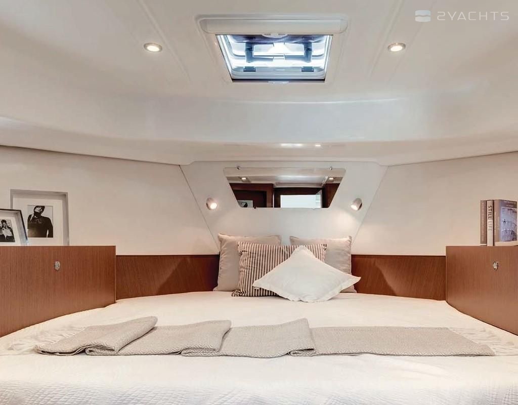 Boat equipment features bow thruster. It also boasts a flat screen tv, heating, an audio system, outside speakers and flybridge. The fully-equipped galley includes a cooker, sink and kitchen utensils.