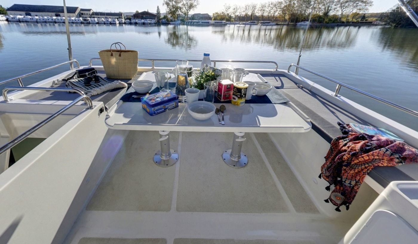 This houseboat is equipped with bimini and bow thruster. In chilly weather, guests will benefit from heating. an audio system, dvd player, outside speakers, flybridge and inside speakers are also available.