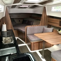 Boat equipment features bimini and bow thruster. It also boasts a flat screen tv, heating, an audio system and inside speakers. The fully-equipped galley includes a microwave, cooker, sink and kitchen utensils.