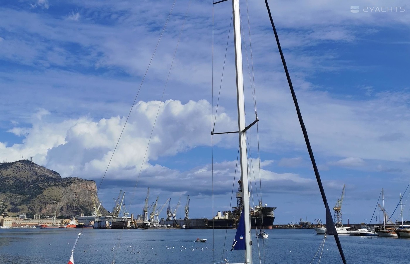 4-cabin sailing yacht Dufour 45 - Genea Sea was built in 2001, (renovated in 2021,) and it is docked in Marsala Marina, Italy.