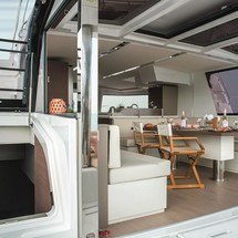 Boat equipment features classical mainsail, electric winches, solar panels, generator, bbq and bimini. It also boasts a flat screen tv, heating, air conditioning, an audio system and outside speakers. The fully-equipped galley includes a dishwasher, ice maker, freezer, oven and cooker.