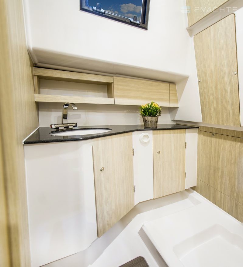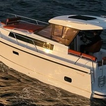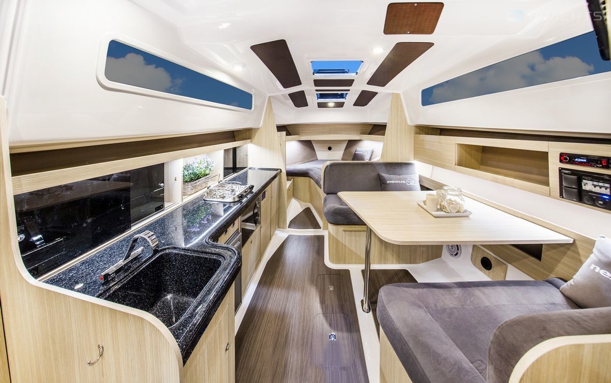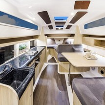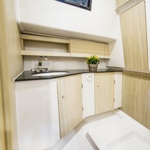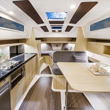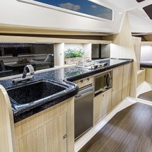 Boat equipment features bow thruster. It also boasts a flat screen tv, heating, an audio system and inside speakers. The fully-equipped galley includes a microwave, cooker, sink and kitchen utensils.