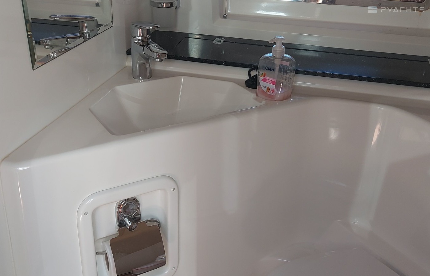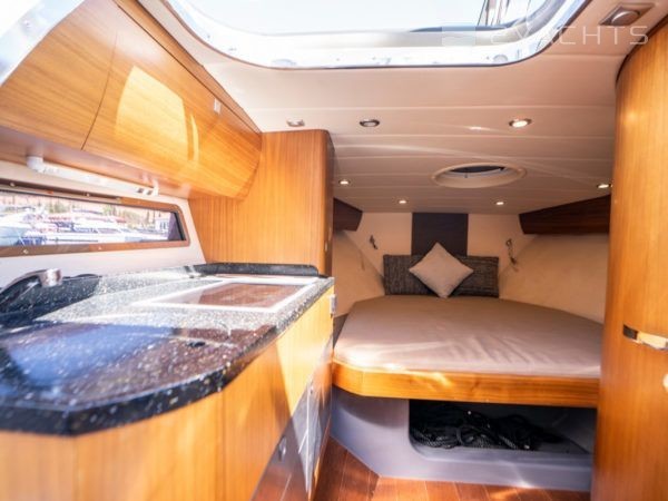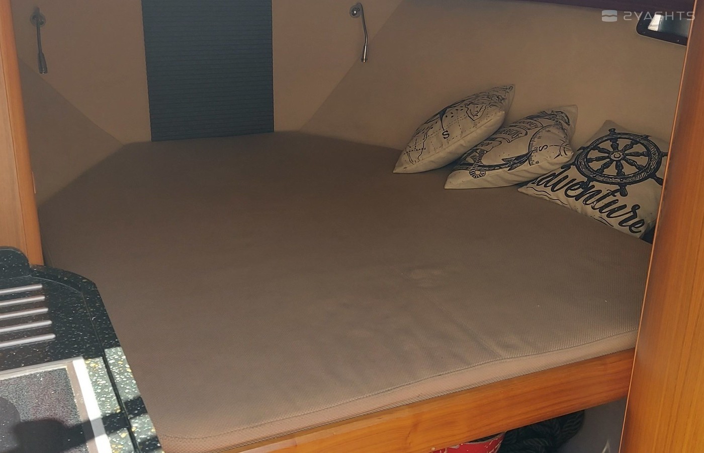 Boat equipment features bimini and bow thruster. It also boasts an an audio system and outside speakers. The fully-equipped galley includes a cooker, sink and kitchen utensils.