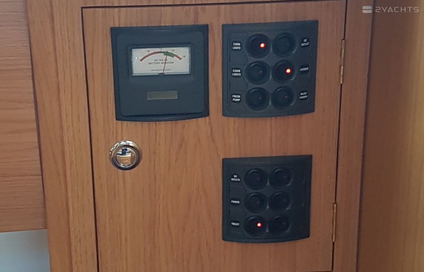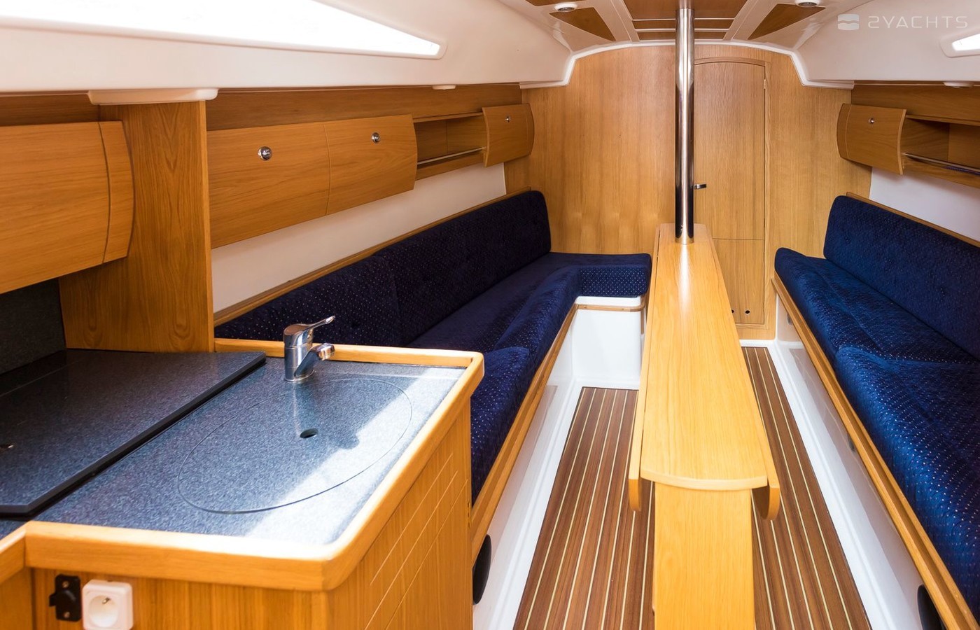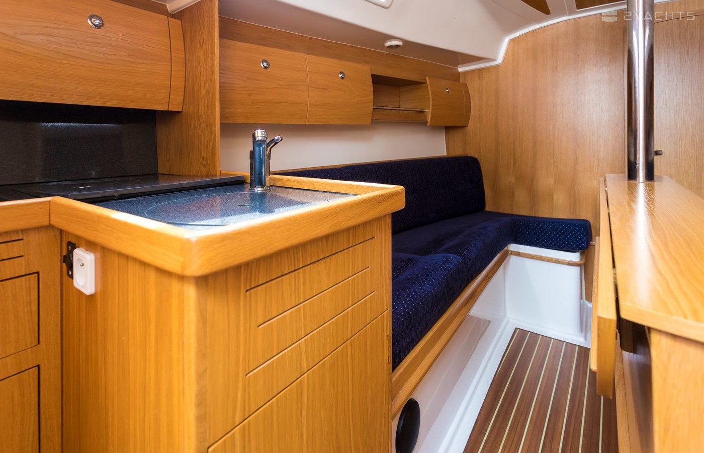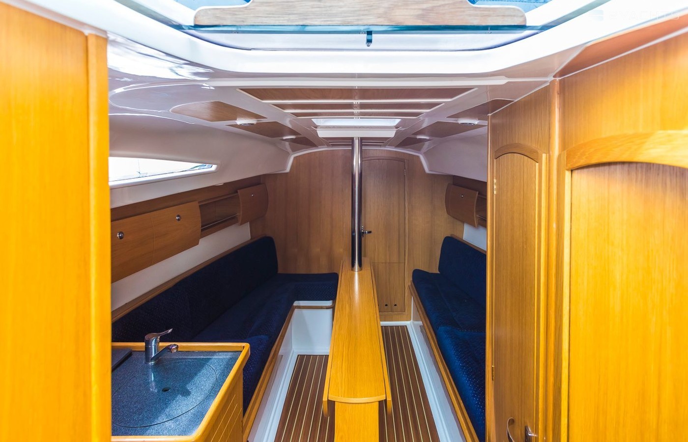 Boat equipment features classical mainsail. It also boasts a heating, an audio system and inside speakers. The fully-equipped galley includes a cooker, sink and kitchen utensils.