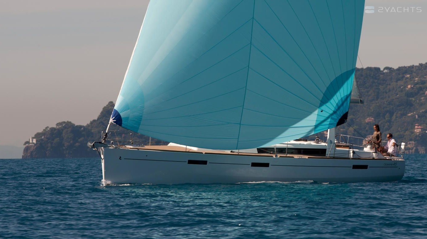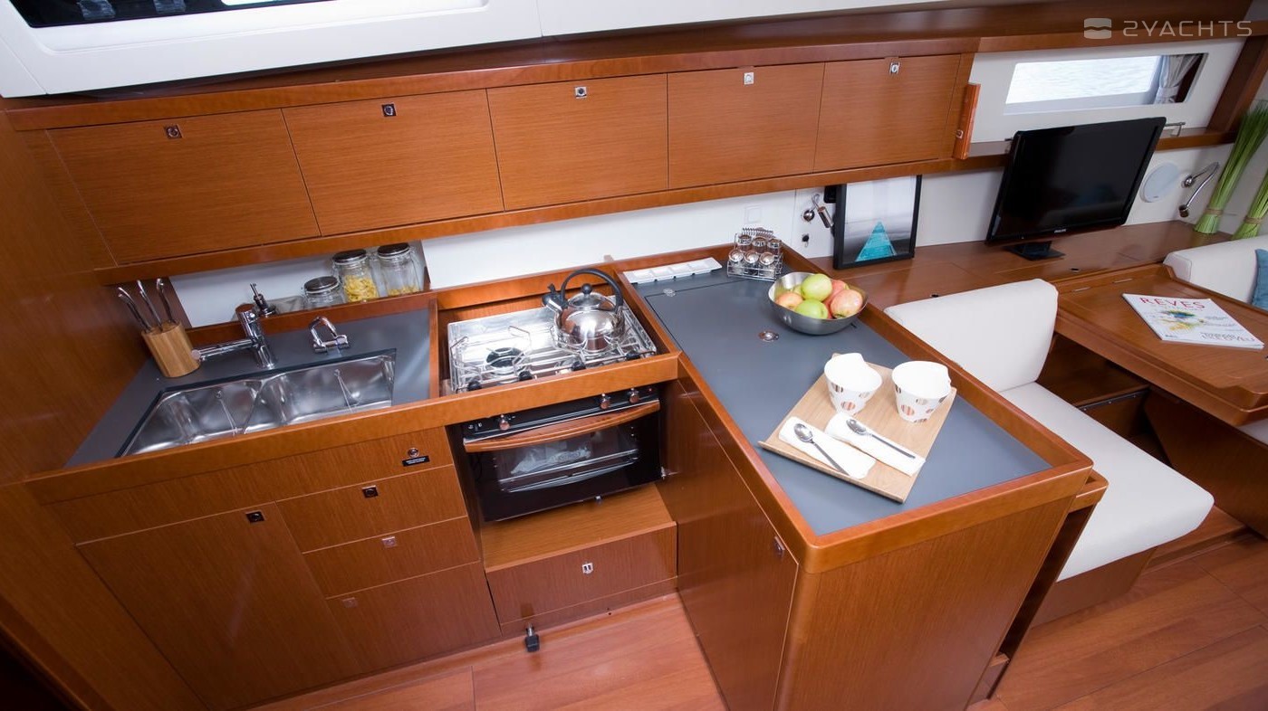 Boat equipment features classical mainsail, electric winches and bow thruster. It also boasts a heating, an audio system and outside speakers. The fully-equipped galley includes a freezer, oven, cooker, sink and kitchen utensils.