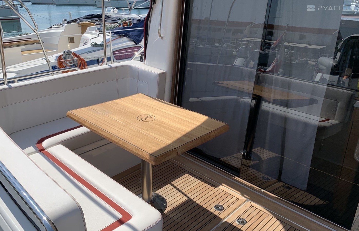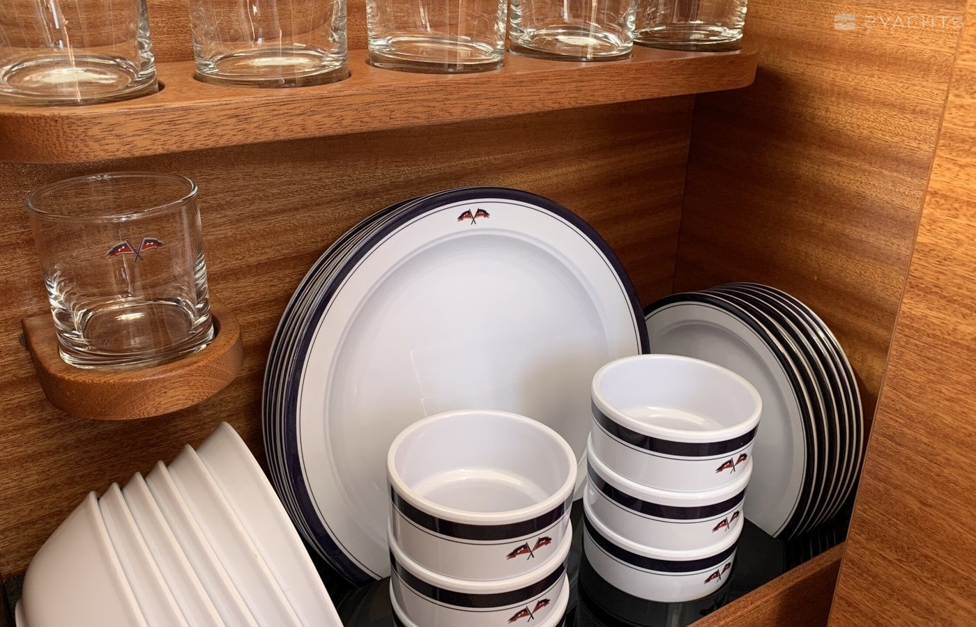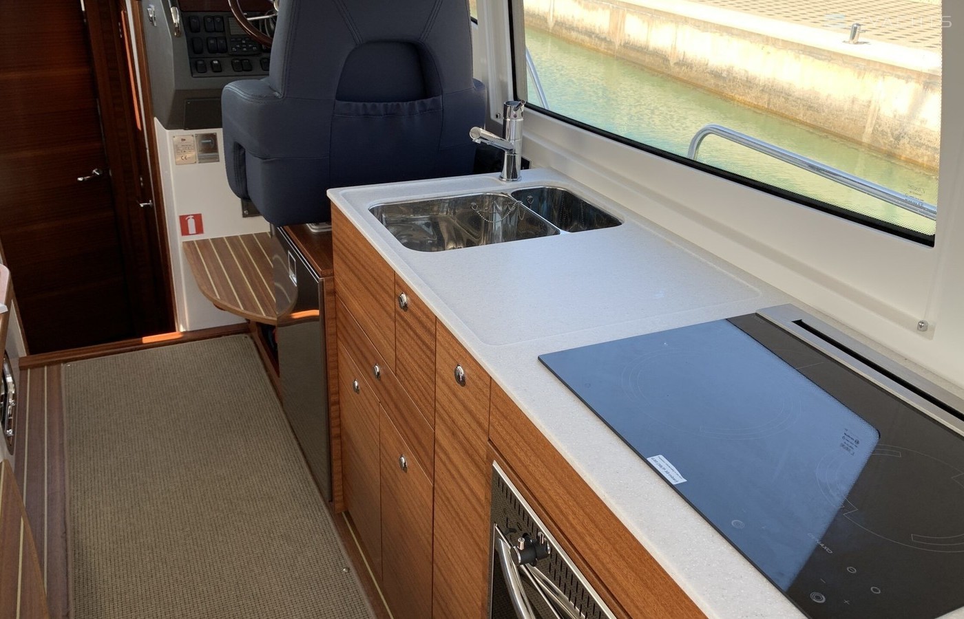 Boat equipment features salon gps plotter, bimini and bow thruster. It also boasts a flat screen tv, an audio system, dvd player, outside speakers and inside speakers. The fully-equipped galley includes a dishwasher, oven, cooker, sink and kitchen utensils.