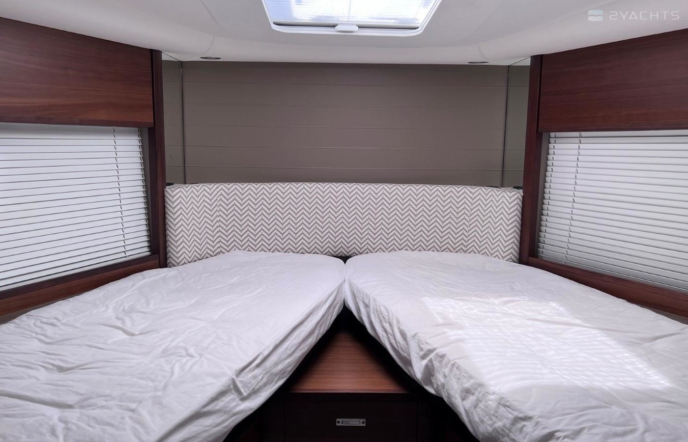 Large double bed with drawers below (option ofscissor berths)WardrobeDeck hatch with integrated fly screen and blindStorage lockersDownlighters and individual berth lightsTrapezoidal side windows with opening portsEn-suite bathroom:Wash basin with Monobloc mixer tapSeparate stall shower with extractorMirrorStorage lockerOpening portlight